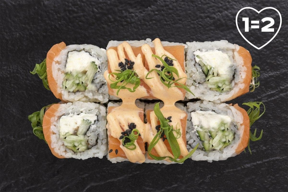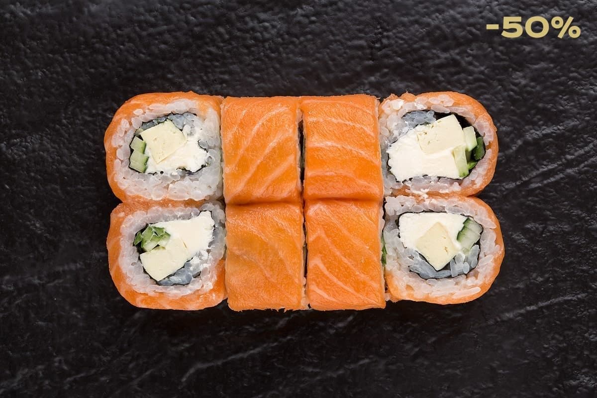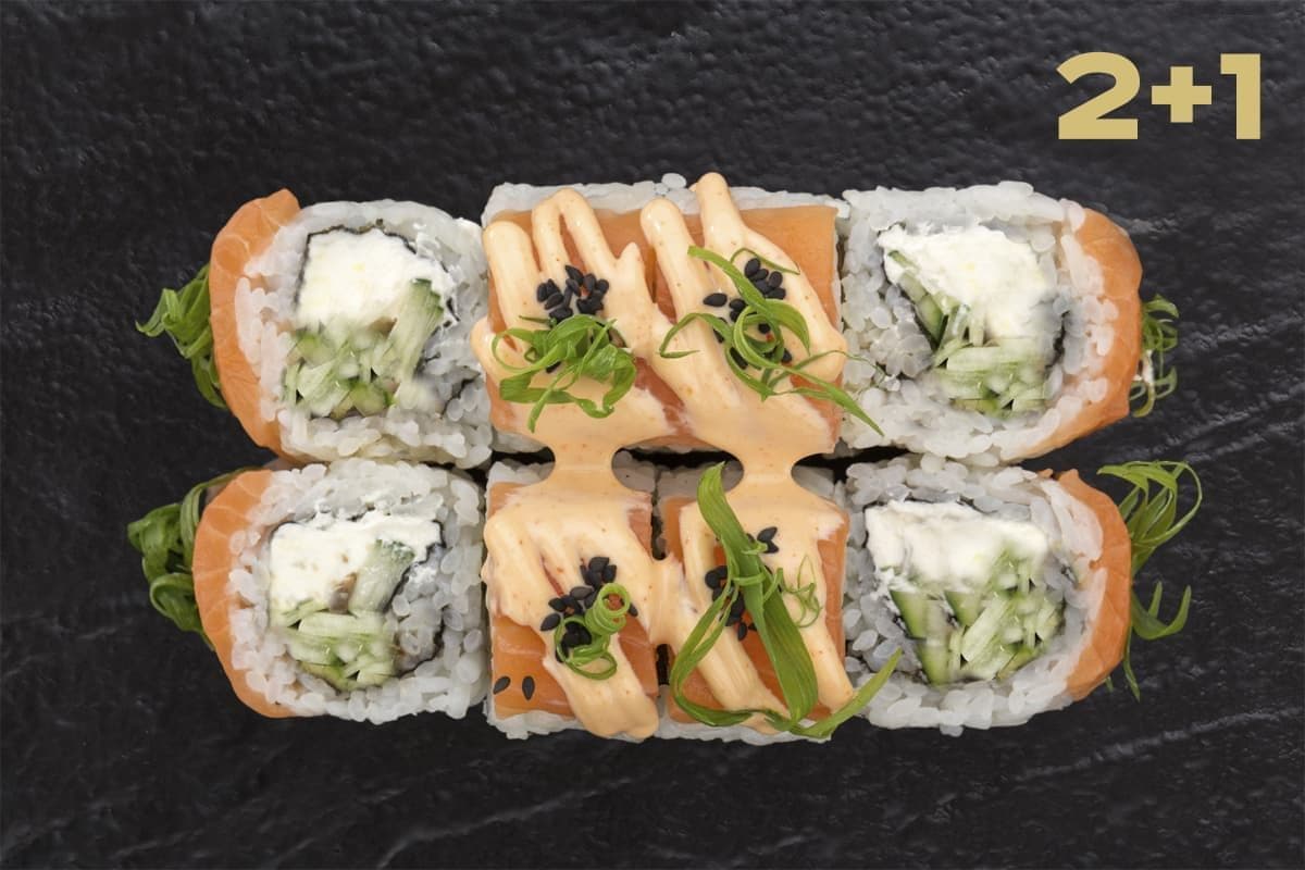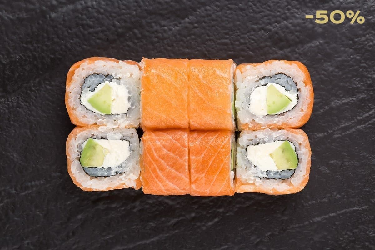 Філадельфія з лососем / Каліфорнія у ікрі з крабом / Філадельфія унагі / Каліфорнія з гострим лососем / рол Футомакі / Каліфорнія з копченним лососем