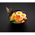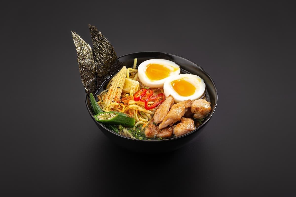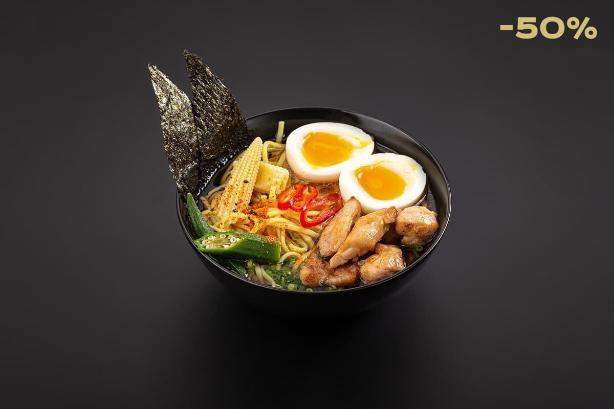 бульйон Рамен / курка / локшина яєчна / яйце / зелена цибуля / кукурудза бебі / чорний кунжут / перець чілі / водорості норі / сім спецій / бамія