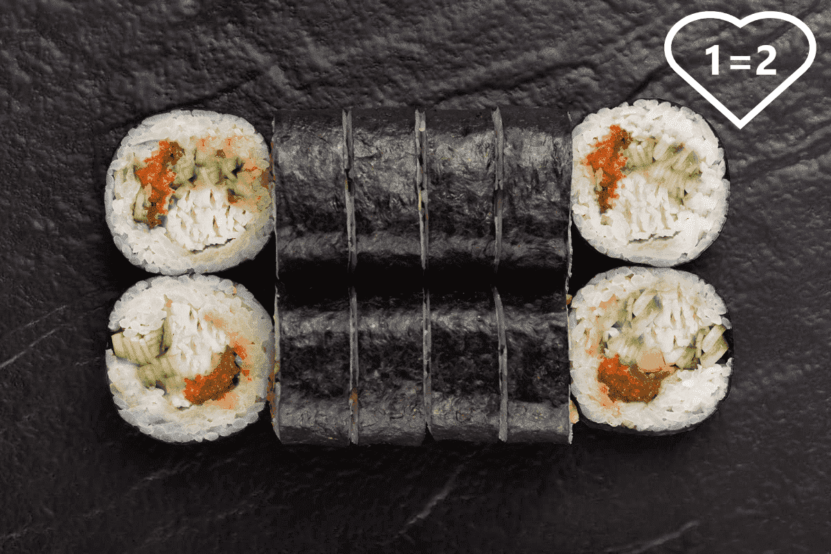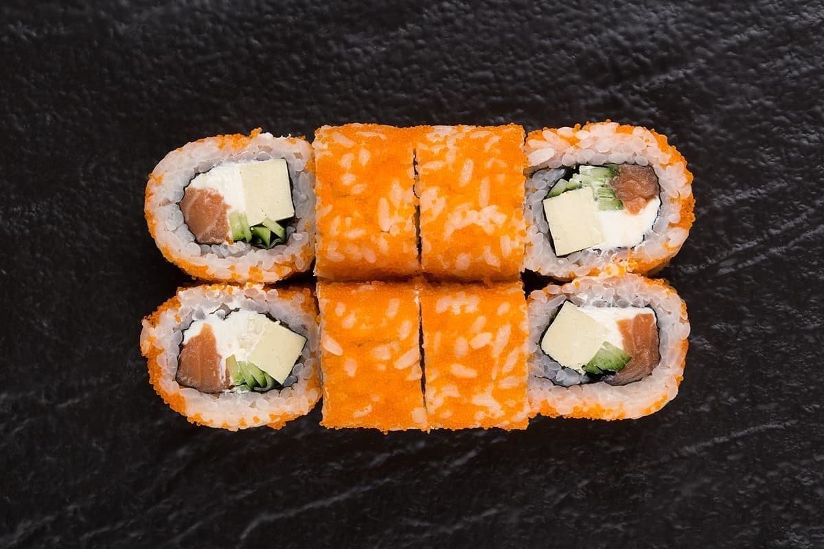 тофу / рис / водорості норі / ікра корюшки / лосось / огірок / суші-сир