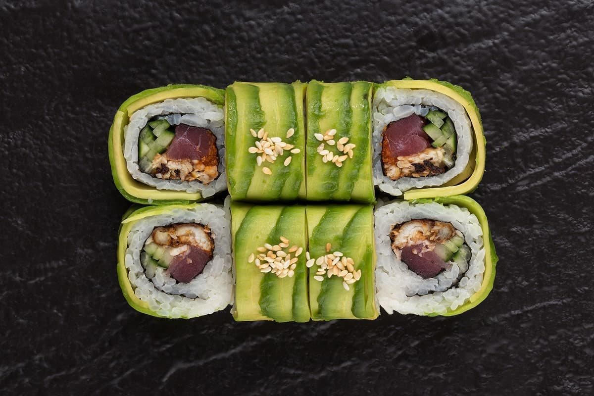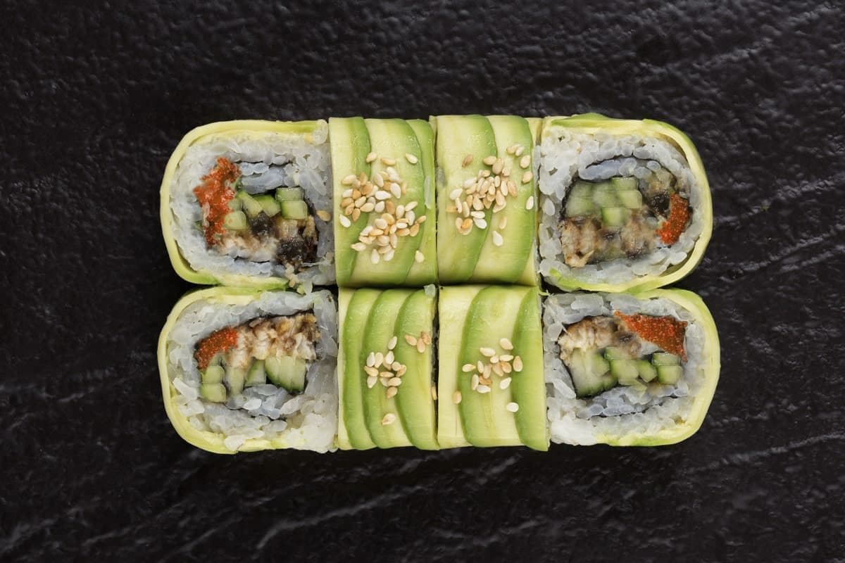 авокадо / ікра корюшки / червоний тунець / огірок / насіння кунжуту / вугор / рис / водорості норі / соус для вугря