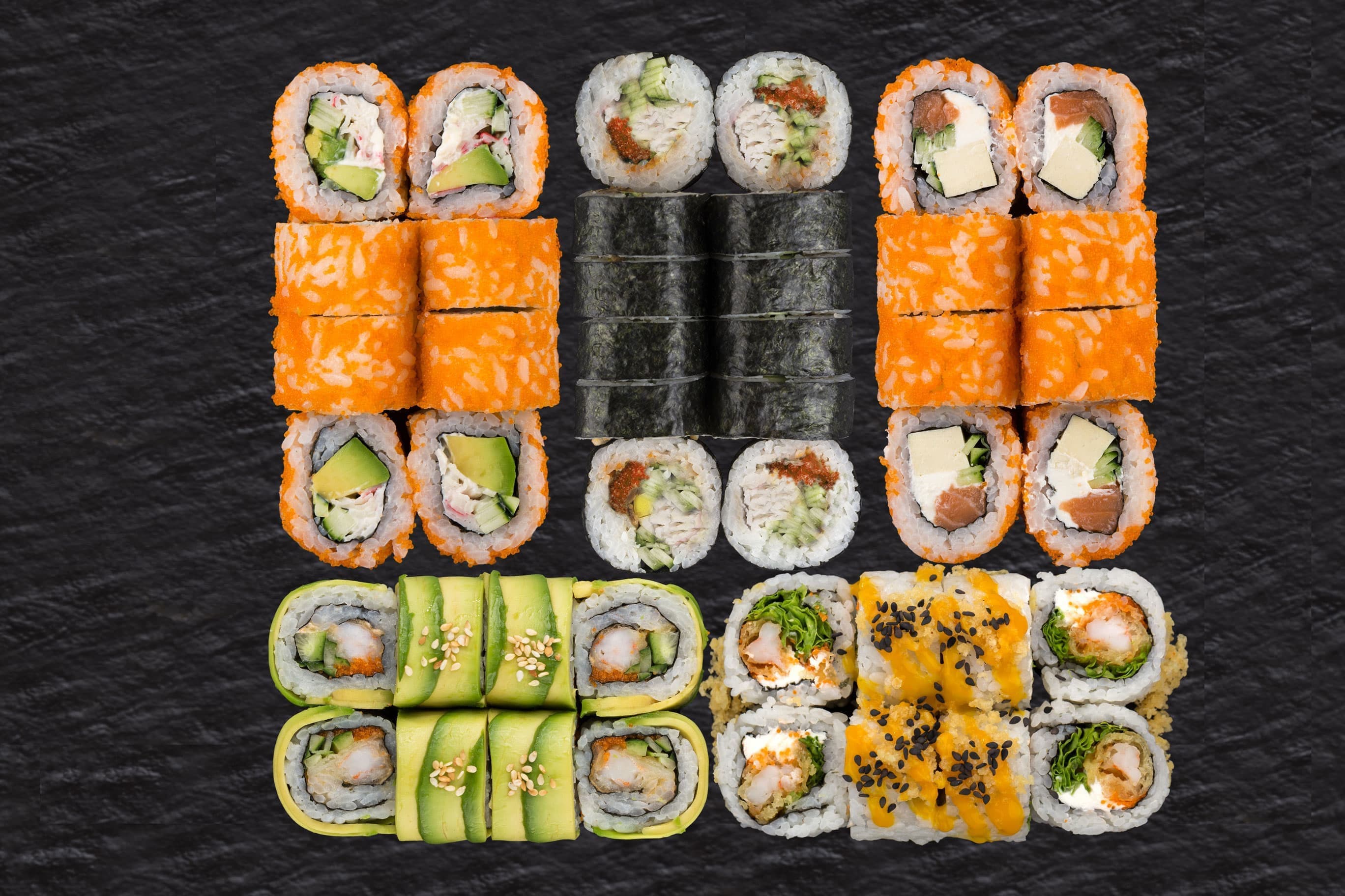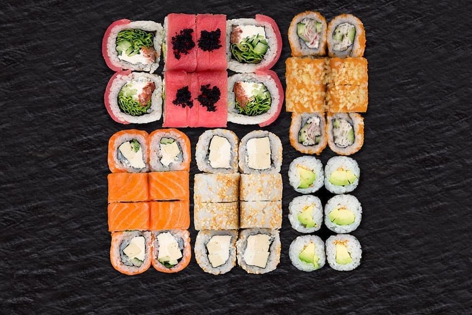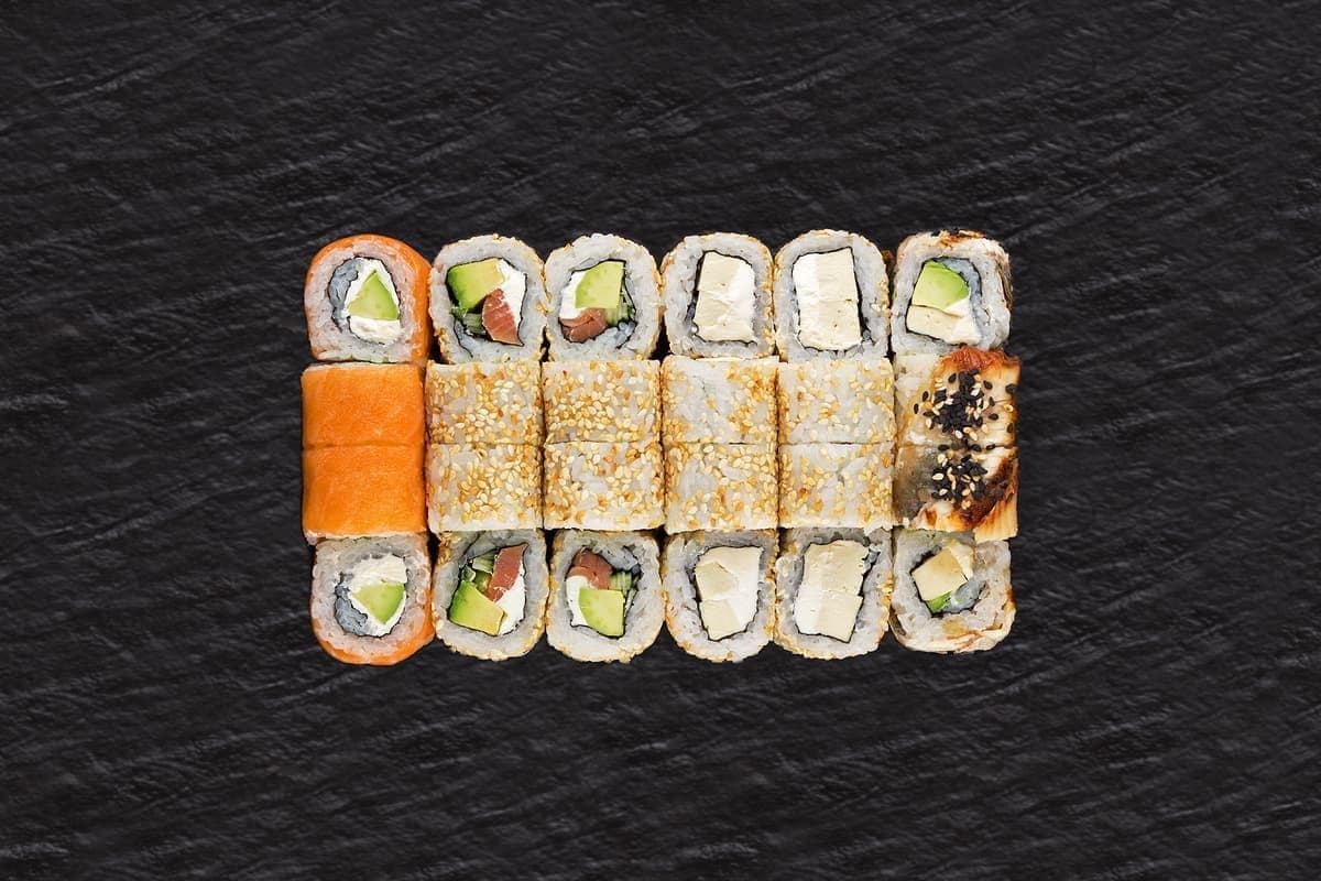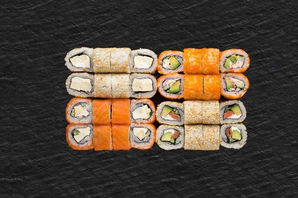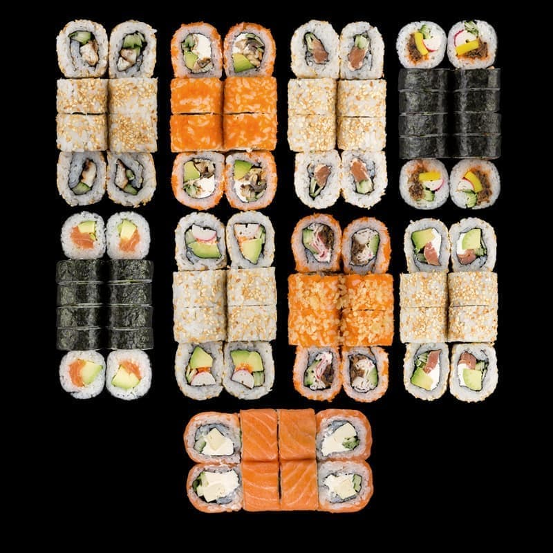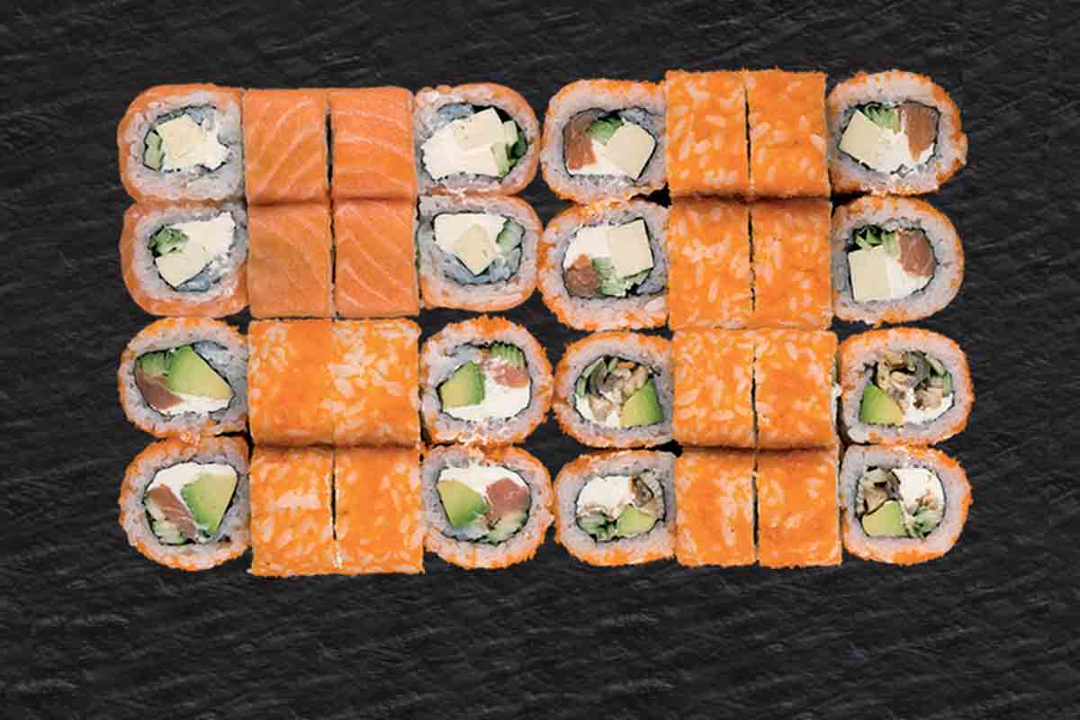 Каліфорнія Краб Кранч / рол Філадельфія у ікрі з вугрем / Каліфорнія з вугрем / Каліфорнія з копченним лососем / рол Каліфорнія / рол Футомакі / рол Сяке авокадо макі / рол філадельфія з лососем / Каліфорнія з гострим лососем
