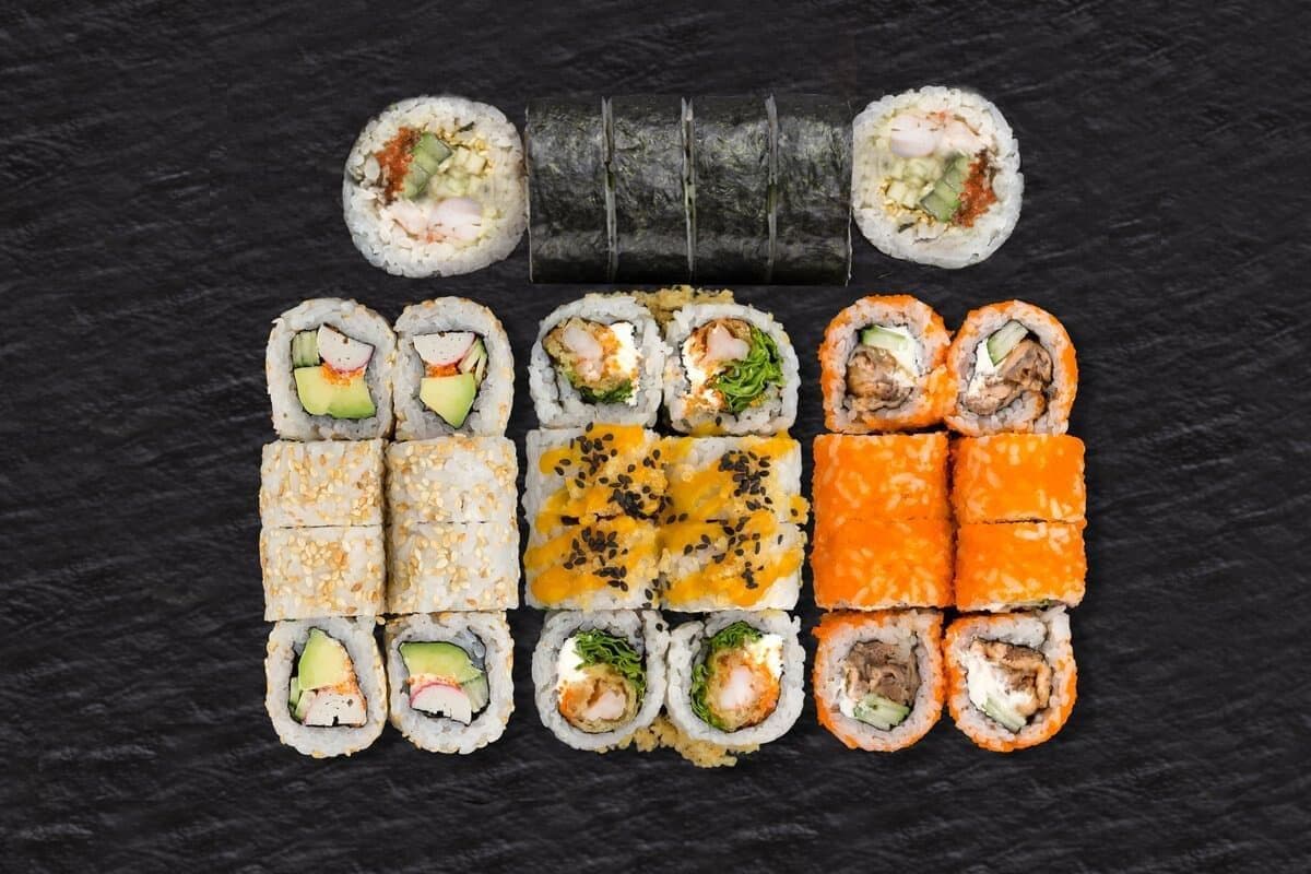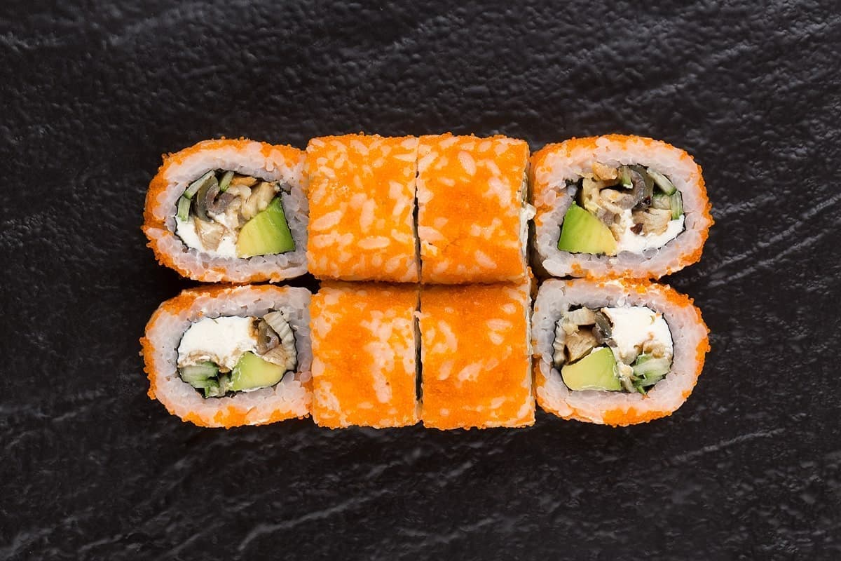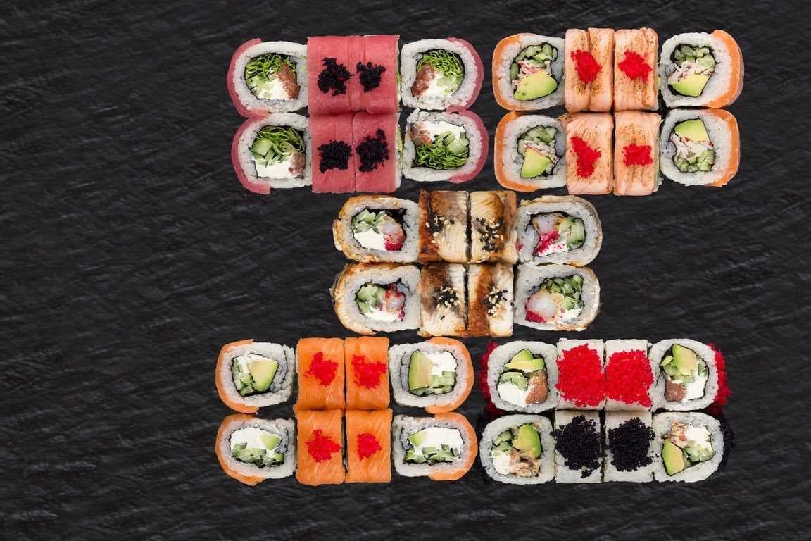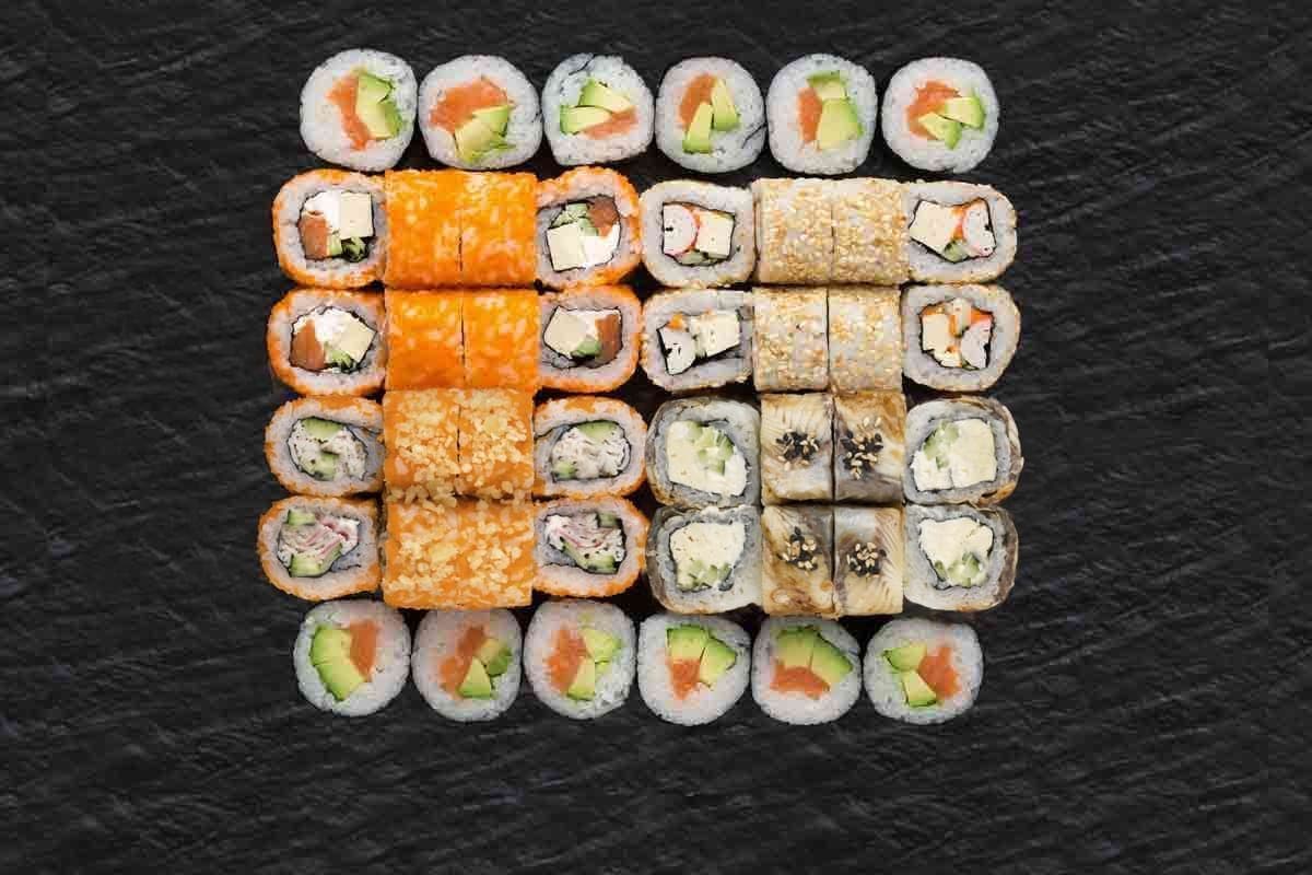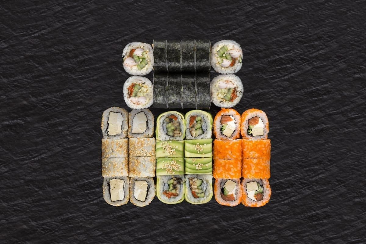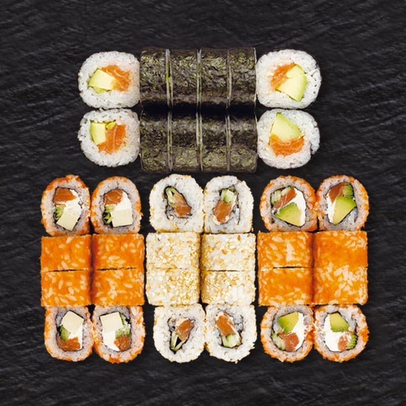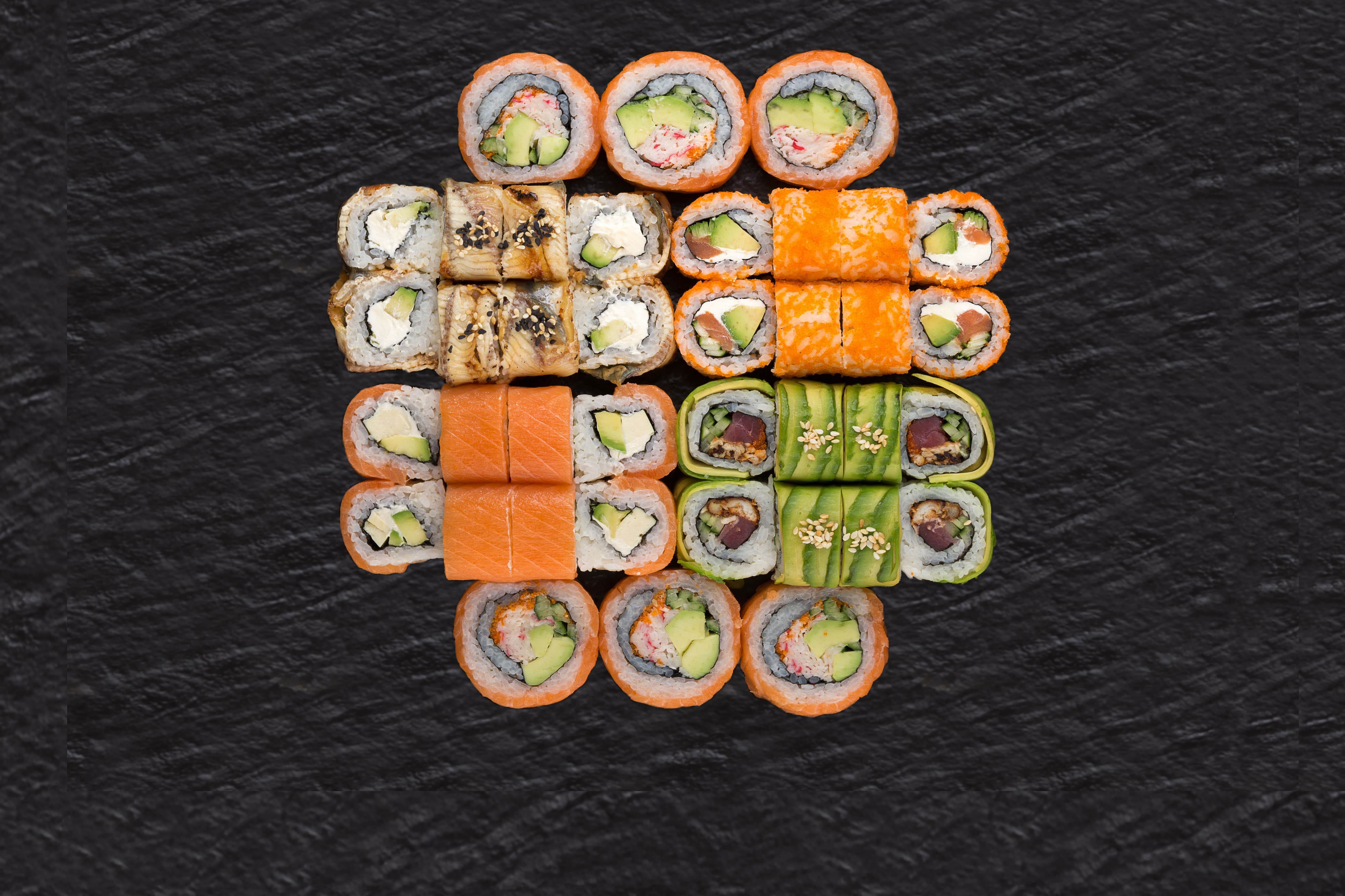 Каліфорнія Краб Кранч / рол Філадельфія у ікрі з вугрем / Каліфорнія з вугрем / Каліфорнія з копченним лососем / рол Каліфорнія / рол Футомакі / рол Сяке авокадо макі / рол філадельфія з лососем / Каліфорнія з гострим лососем