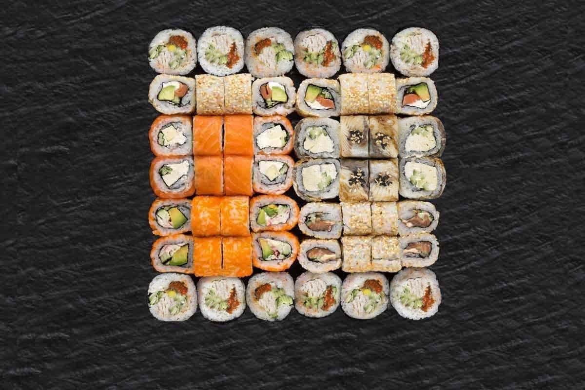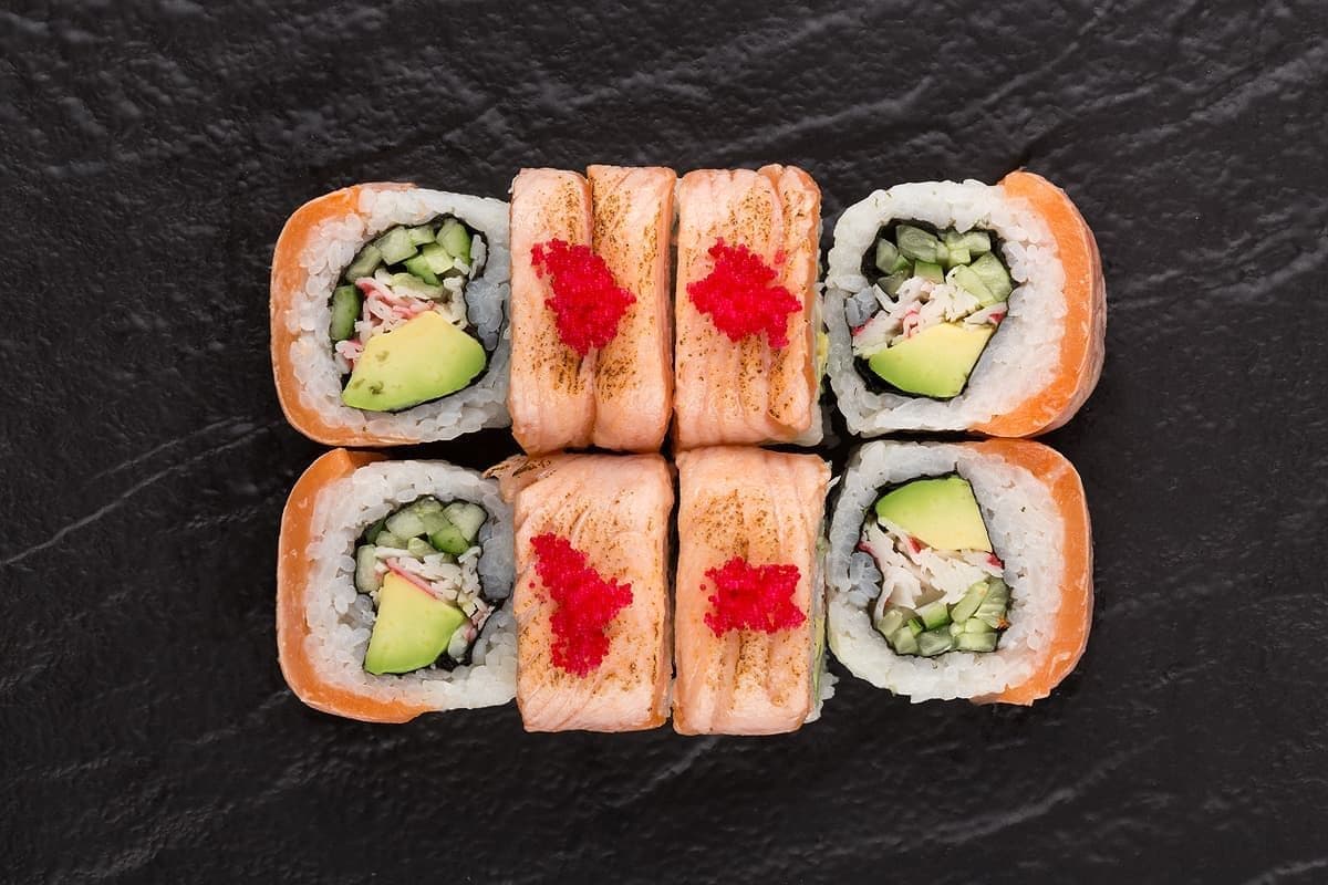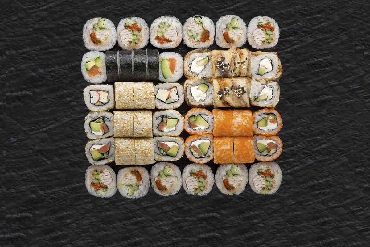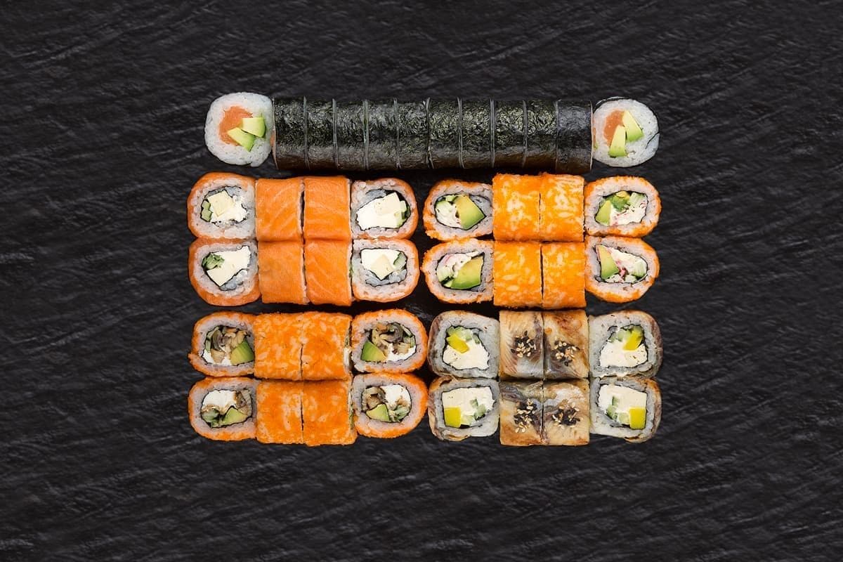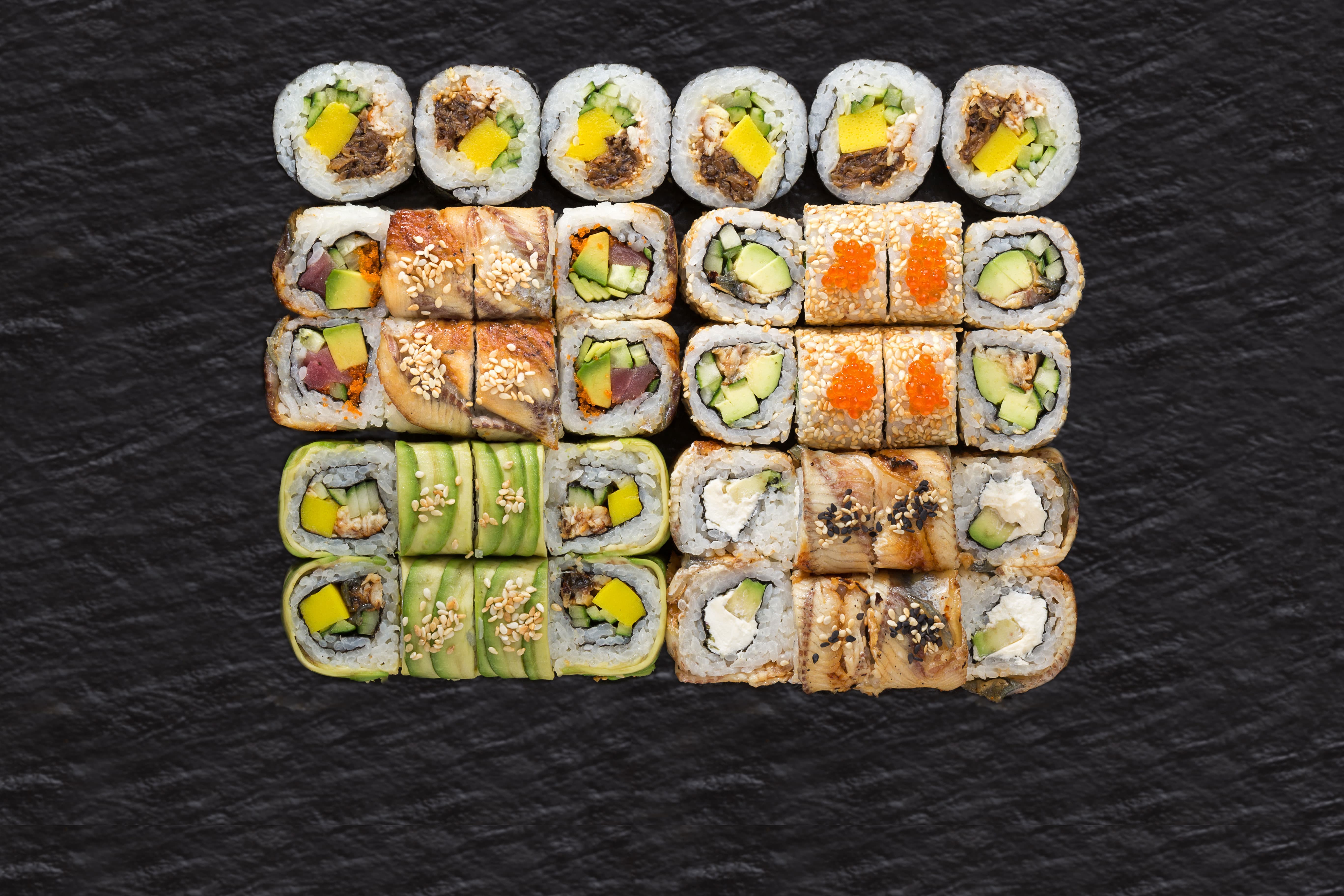 Каліфорнія Краб Кранч / рол Філадельфія у ікрі з вугрем / Каліфорнія з вугрем / Каліфорнія з копченним лососем / рол Каліфорнія / рол Футомакі / рол Сяке авокадо макі / рол філадельфія з лососем / Каліфорнія з гострим лососем
