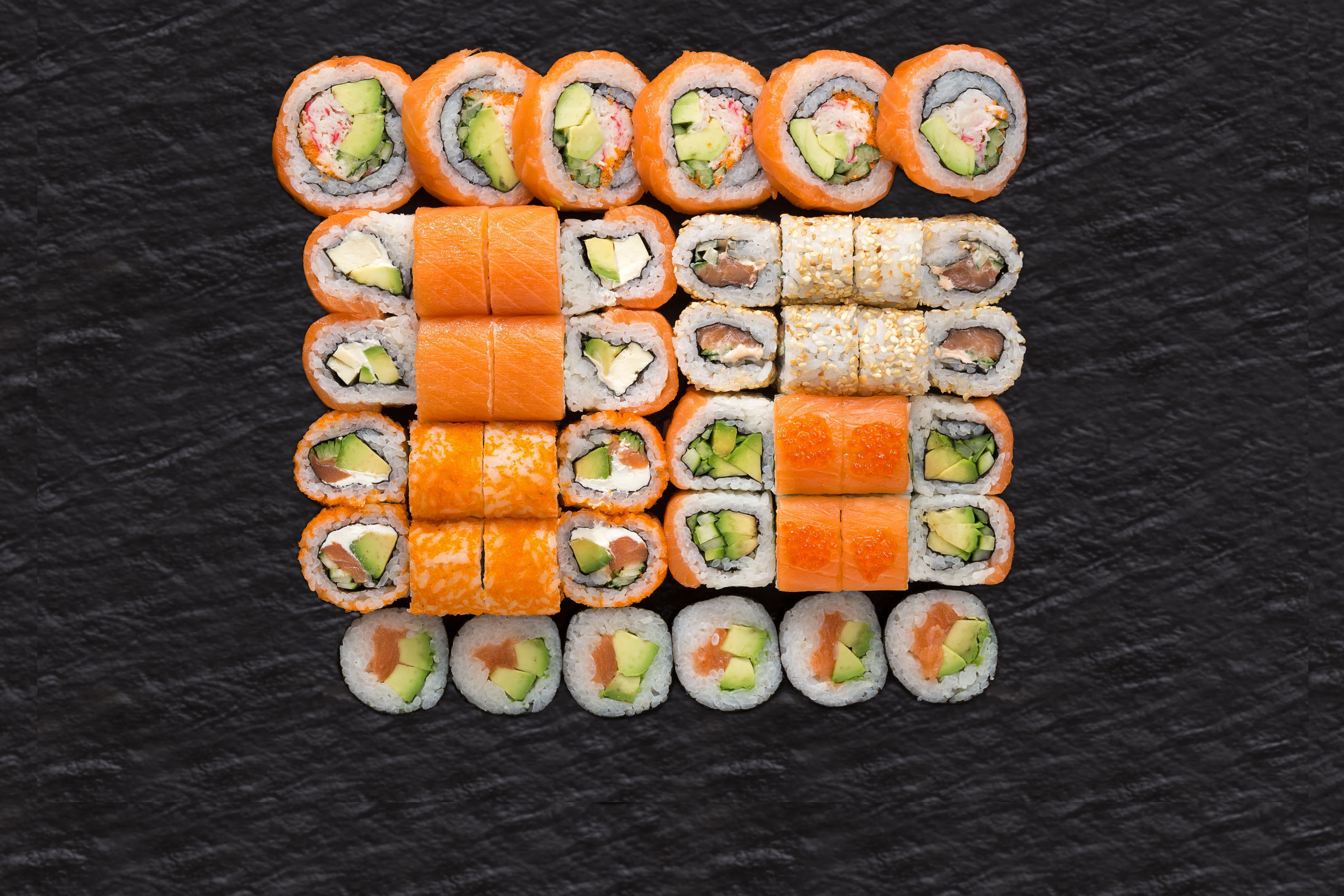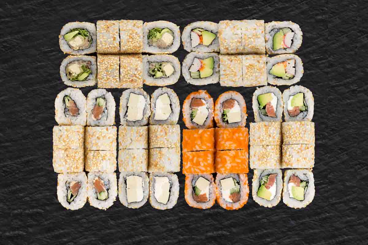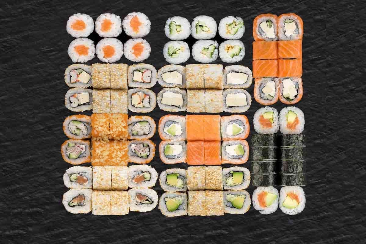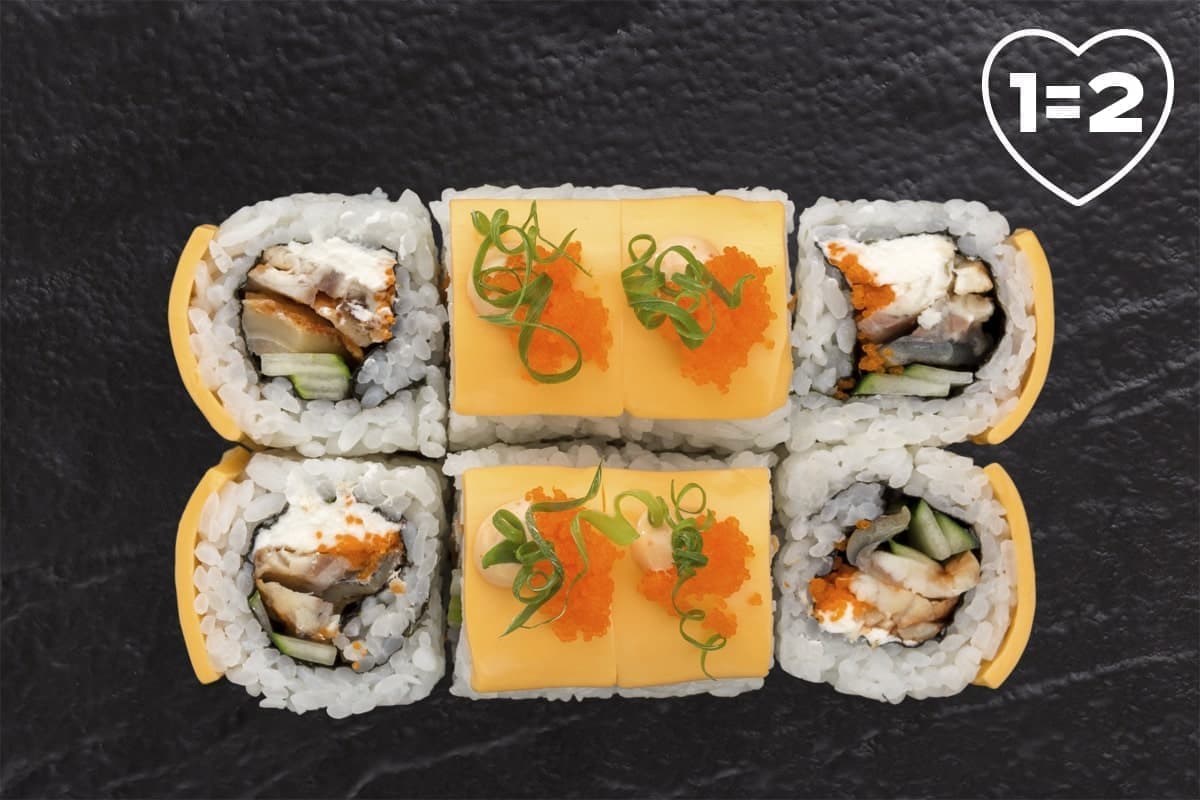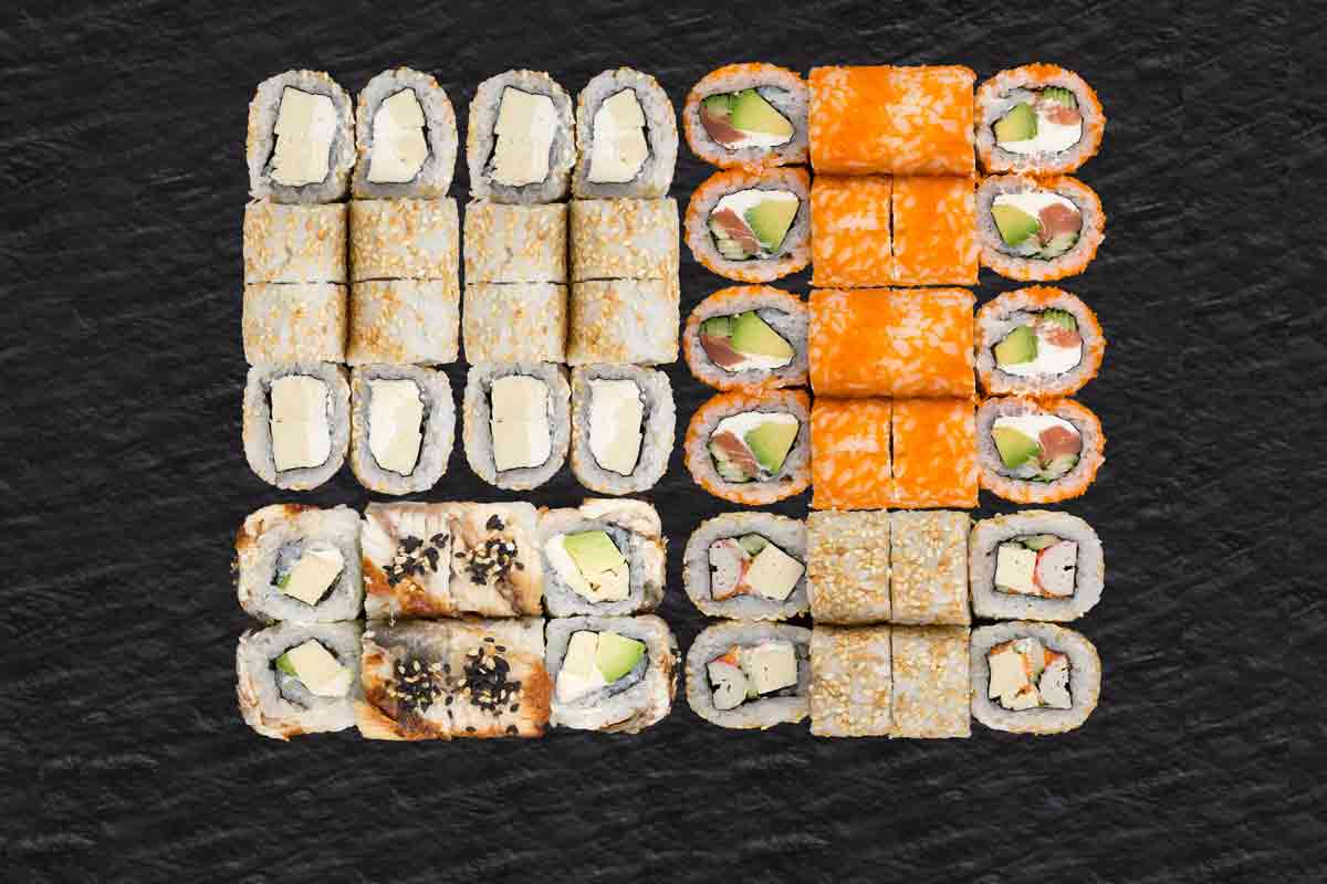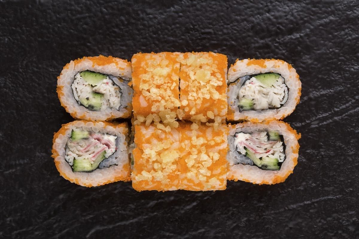 Каліфорнія Краб Кранч / рол Філадельфія у ікрі з вугрем / Каліфорнія з вугрем / Каліфорнія з копченним лососем / рол Каліфорнія / рол Футомакі / рол Сяке авокадо макі / рол філадельфія з лососем / Каліфорнія з гострим лососем