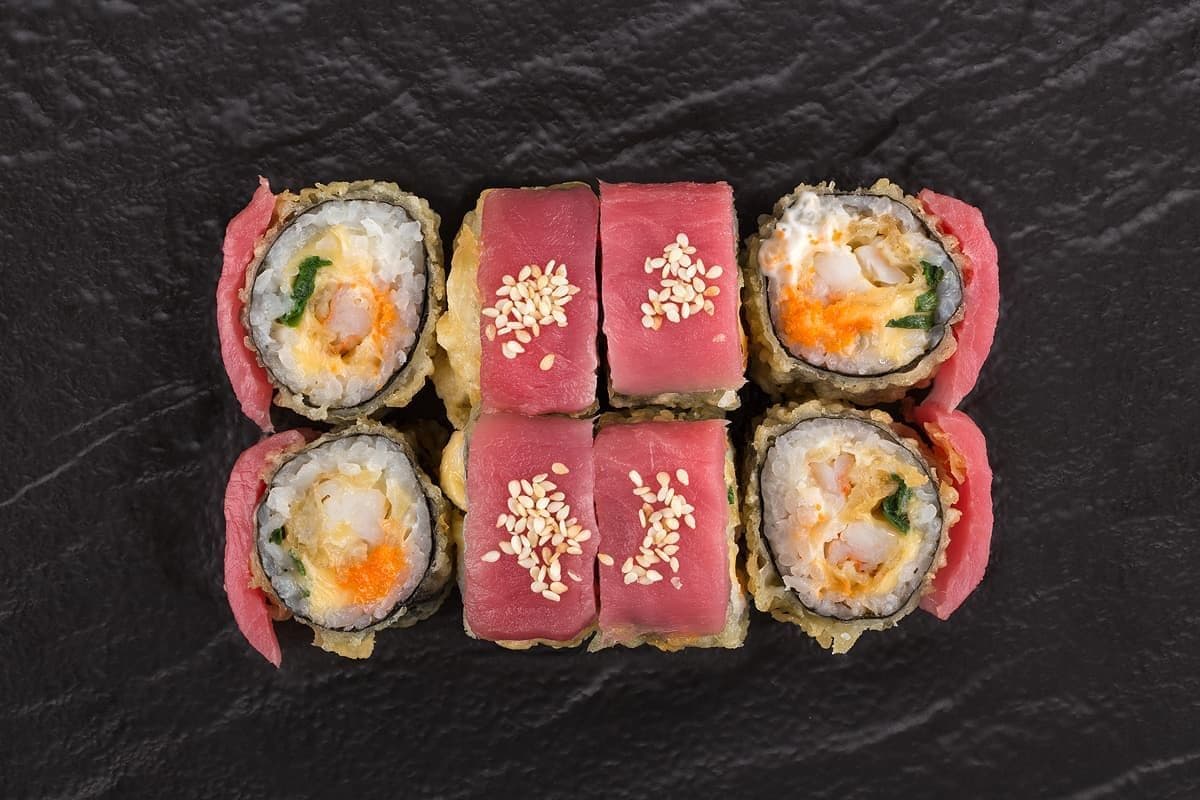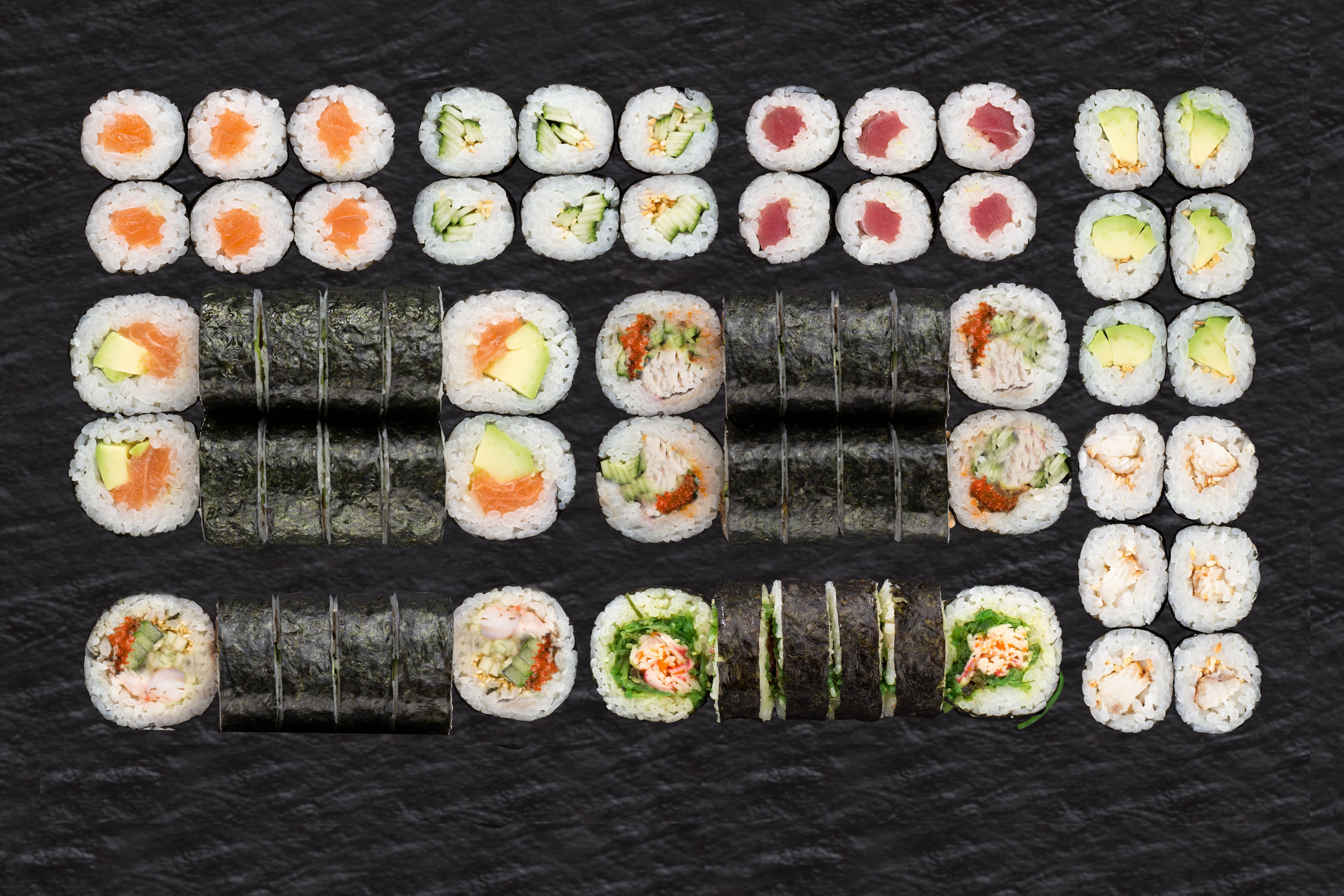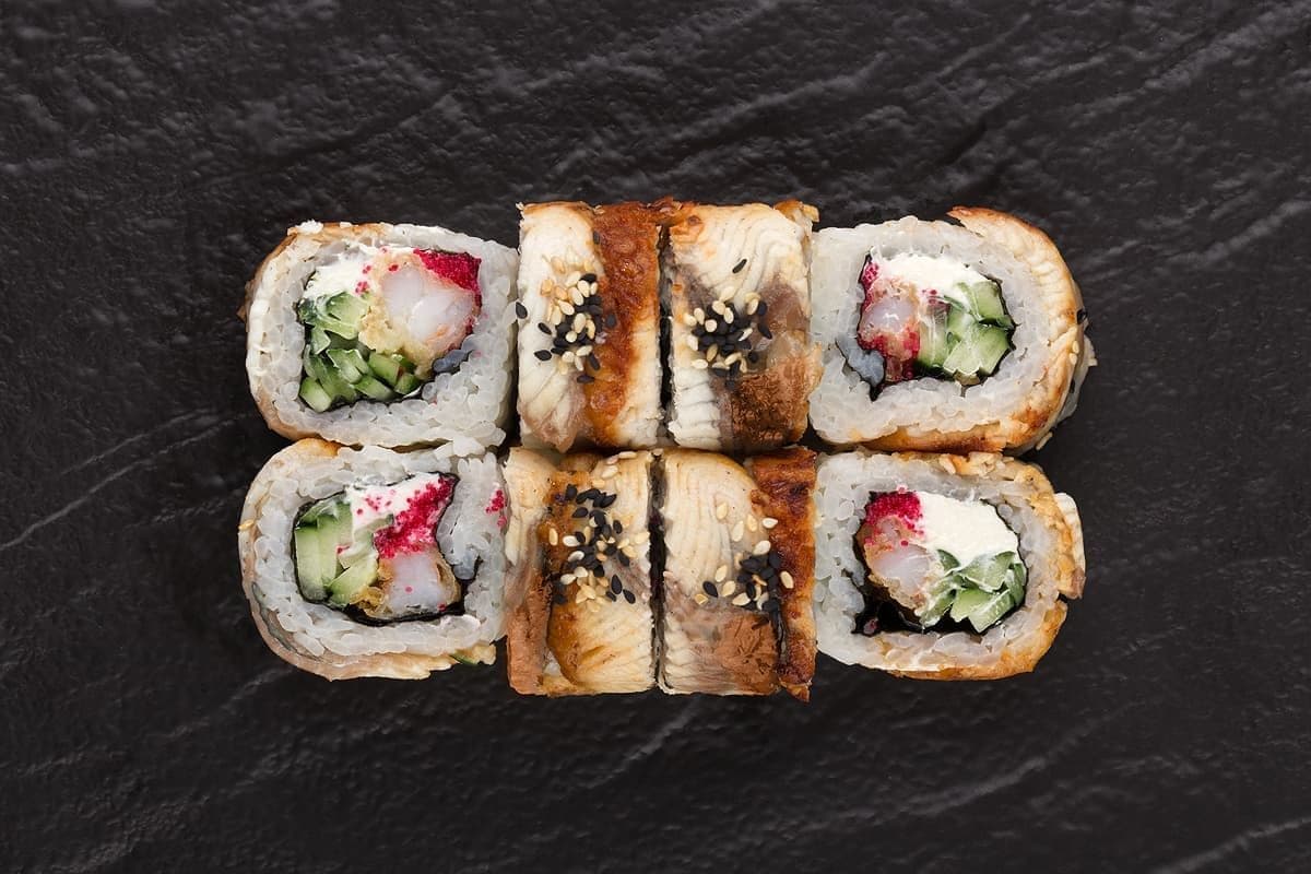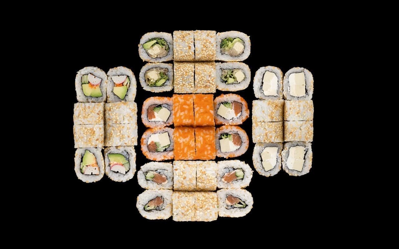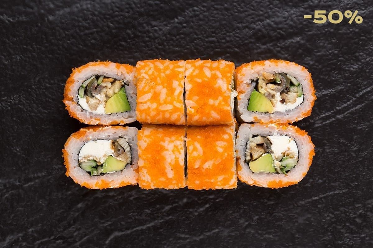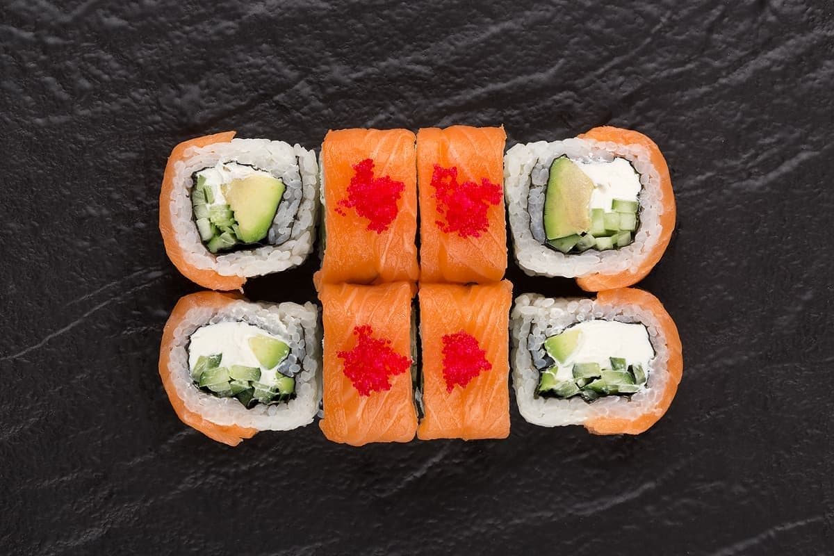 Каліфорнія Краб Кранч / рол Філадельфія у ікрі з вугрем / Каліфорнія з вугрем / Каліфорнія з копченним лососем / рол Каліфорнія / рол Футомакі / рол Сяке авокадо макі / рол філадельфія з лососем / Каліфорнія з гострим лососем