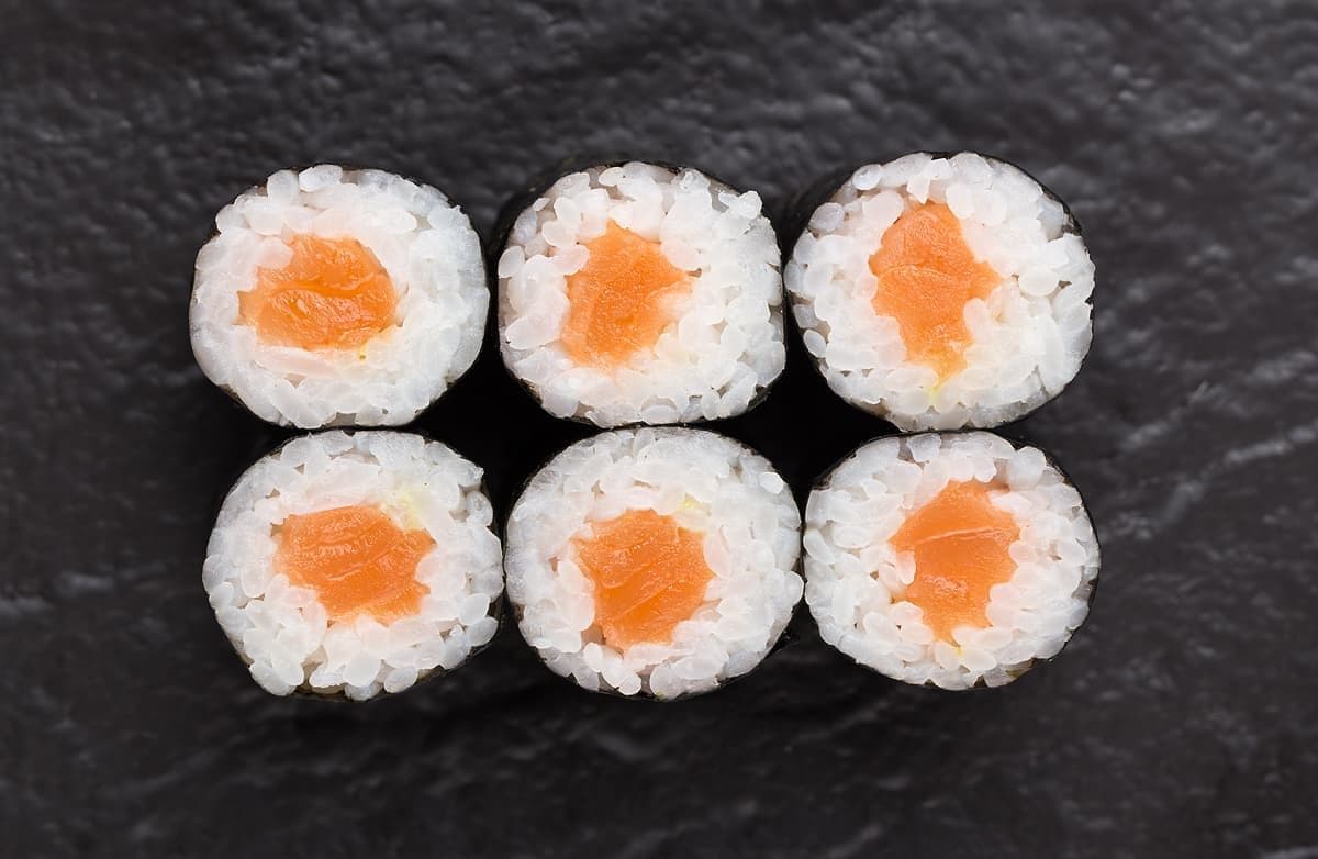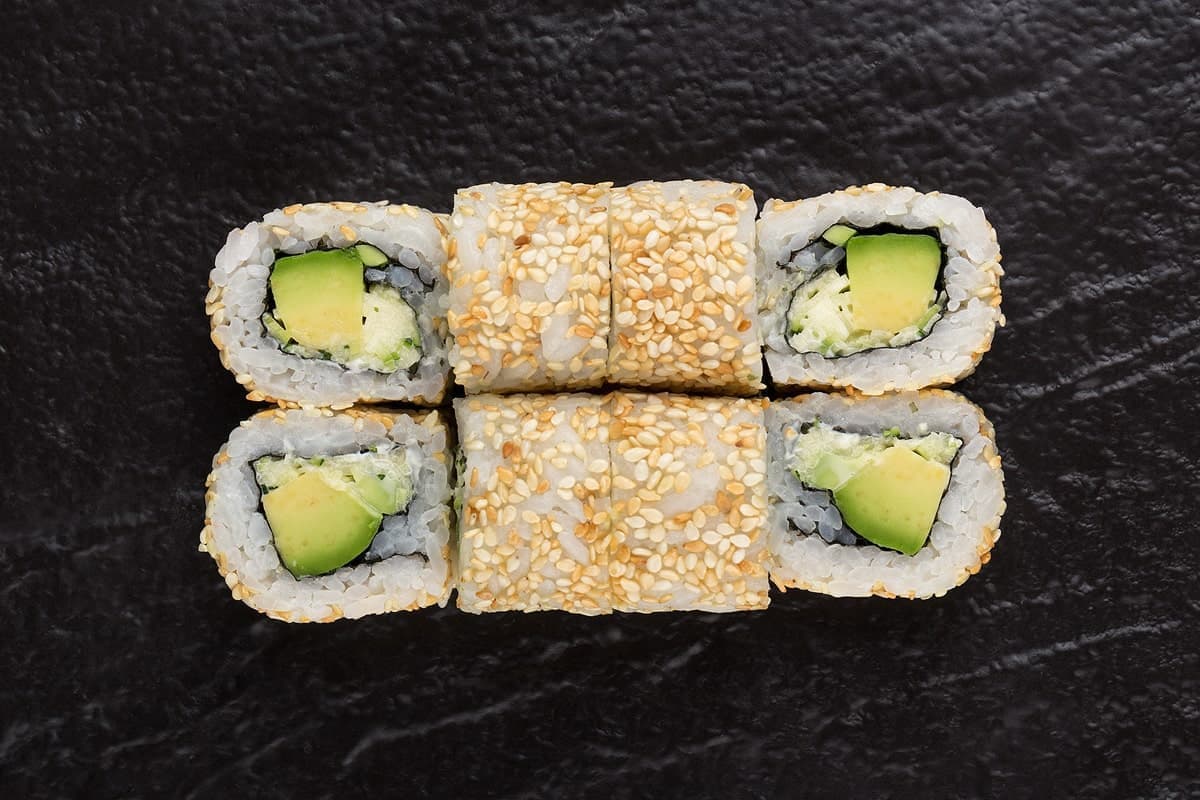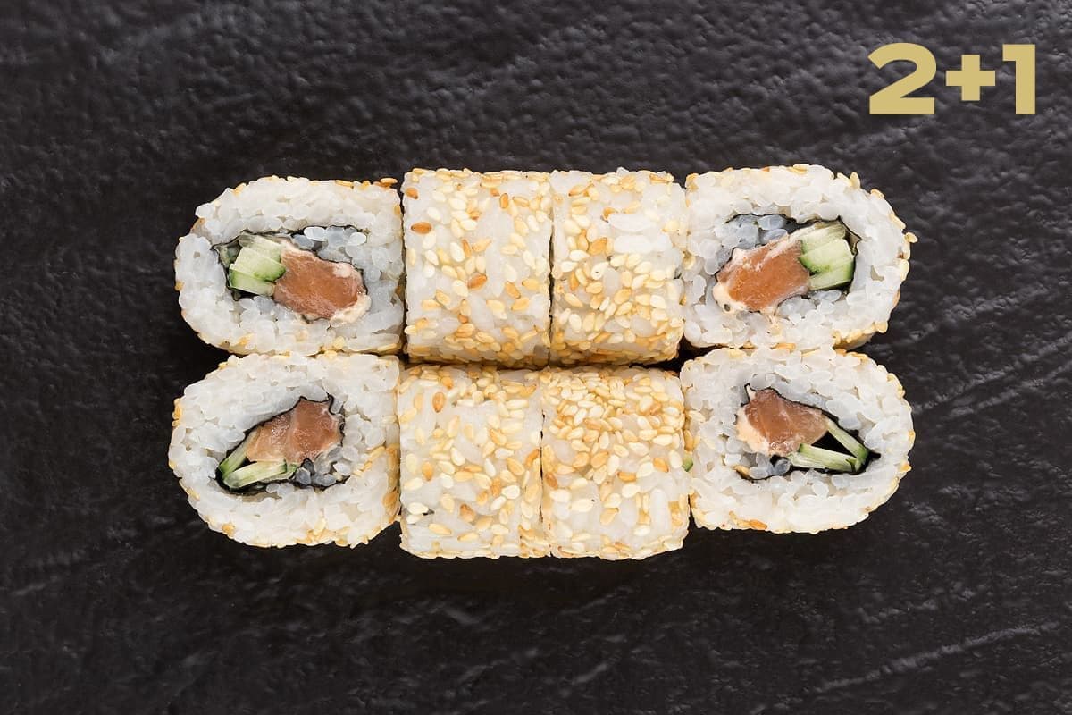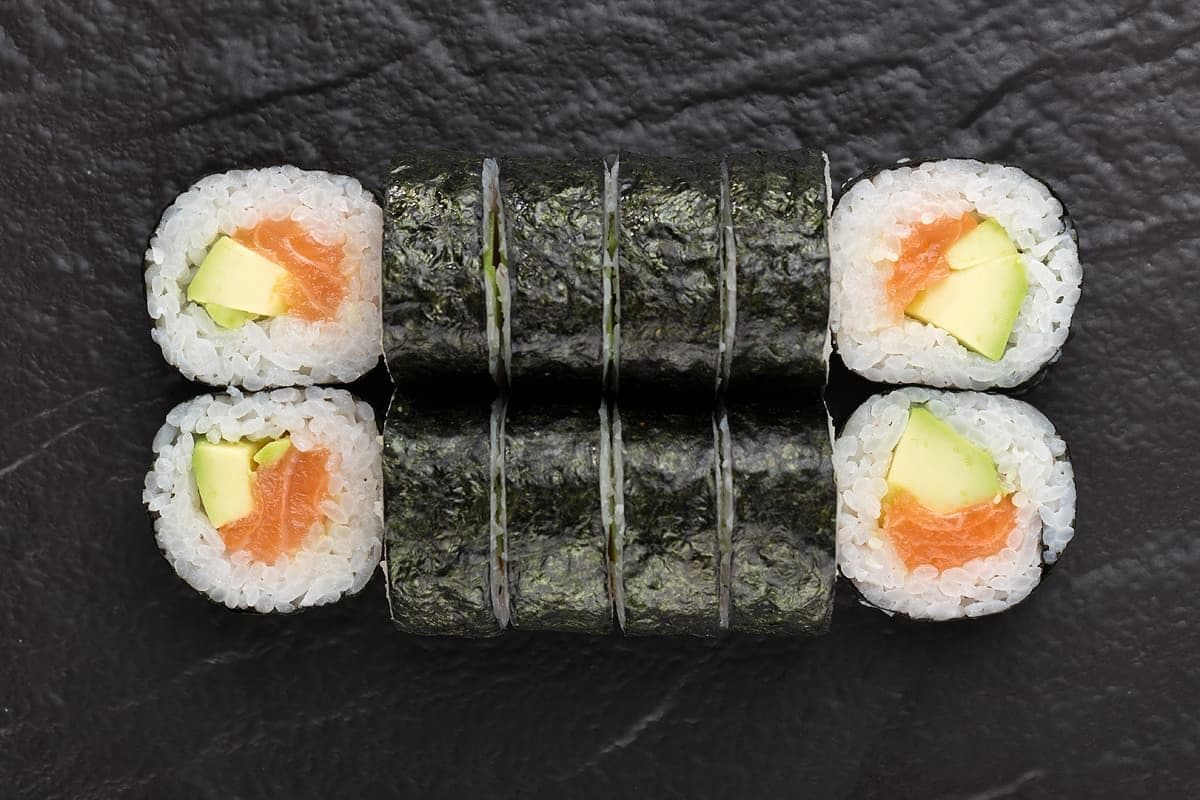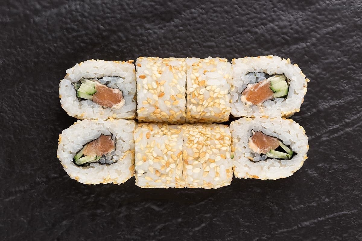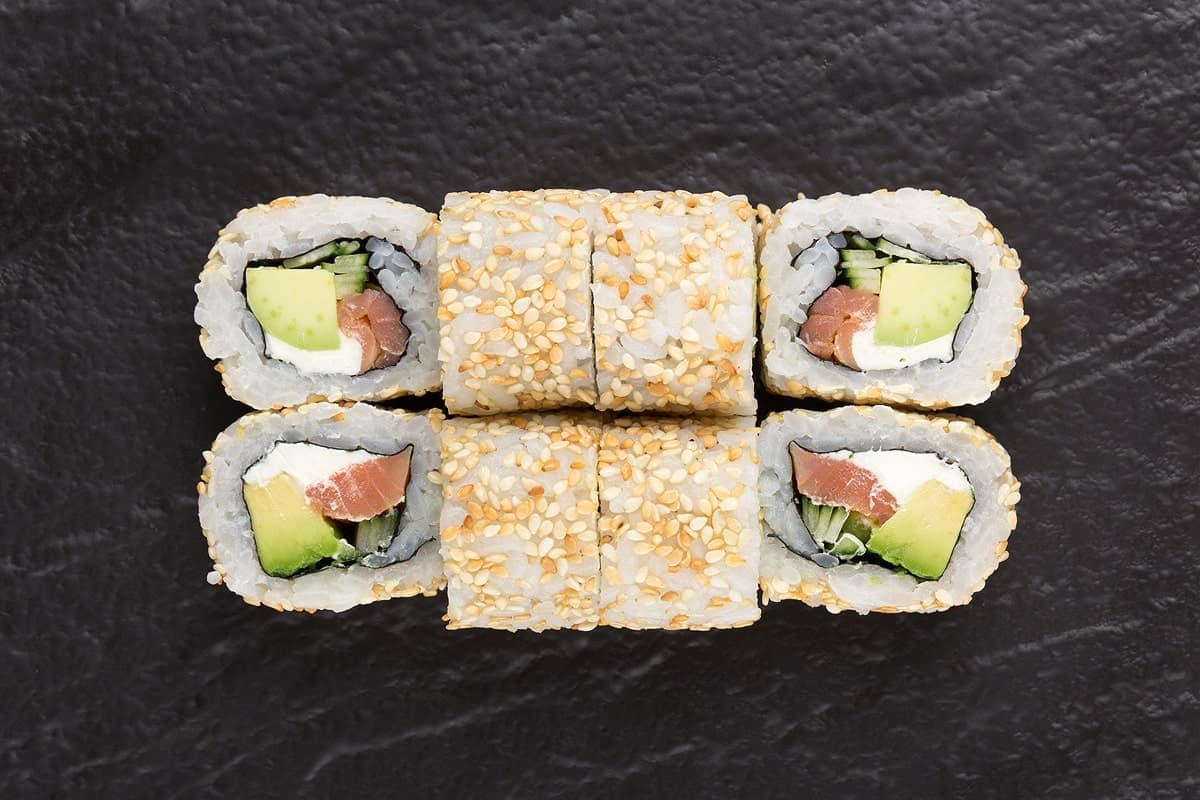 рис / водорості норі / авокадо / копчений лосось / насіння кунжуту / огірок / суші-сир