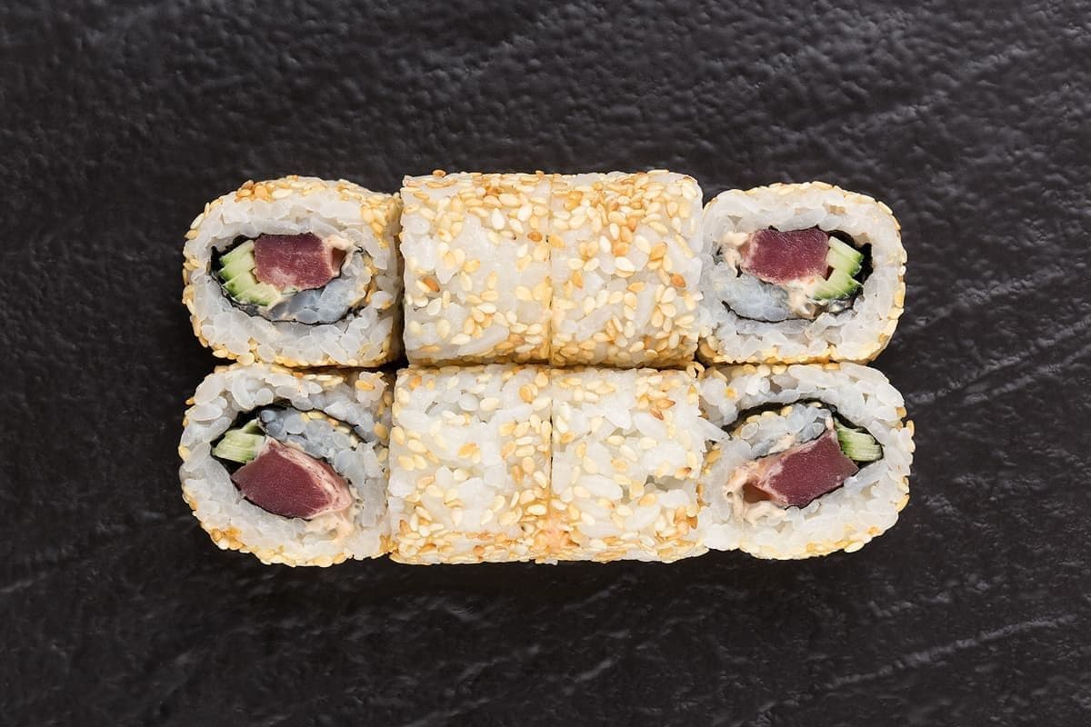 водорості норі / рис / гострий майонез / насіння кунжуту / тунець / огірок