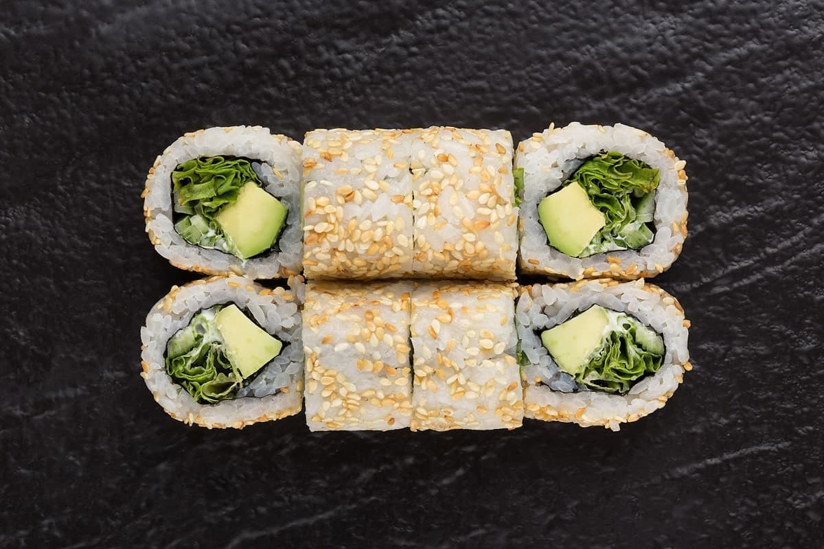 рис / водорості норі / авокадо / листя салату / майонез / насіння кунжуту / огірок
