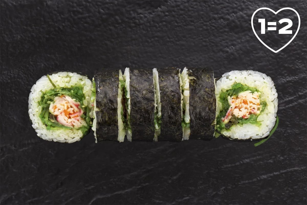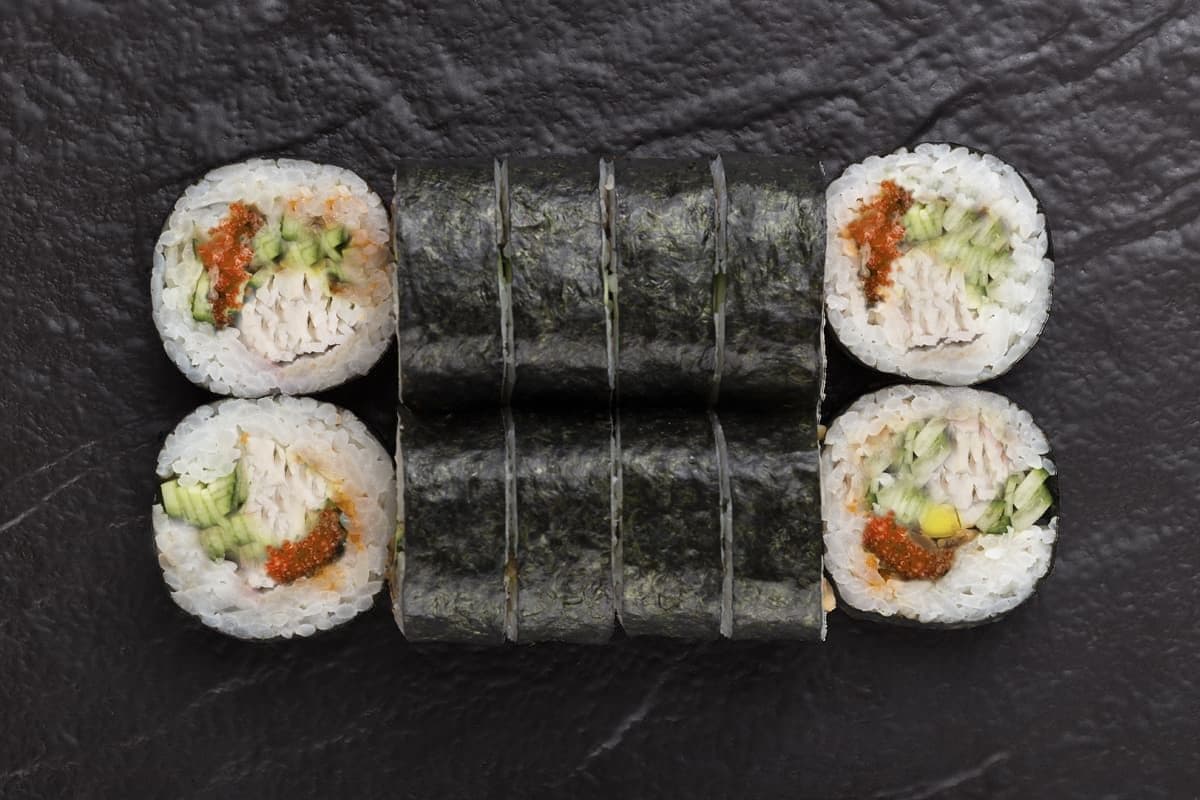 рис / водорості норі / ікра корюшки / Сурімі / майонез / насіння кунжуту / огірок / тофу