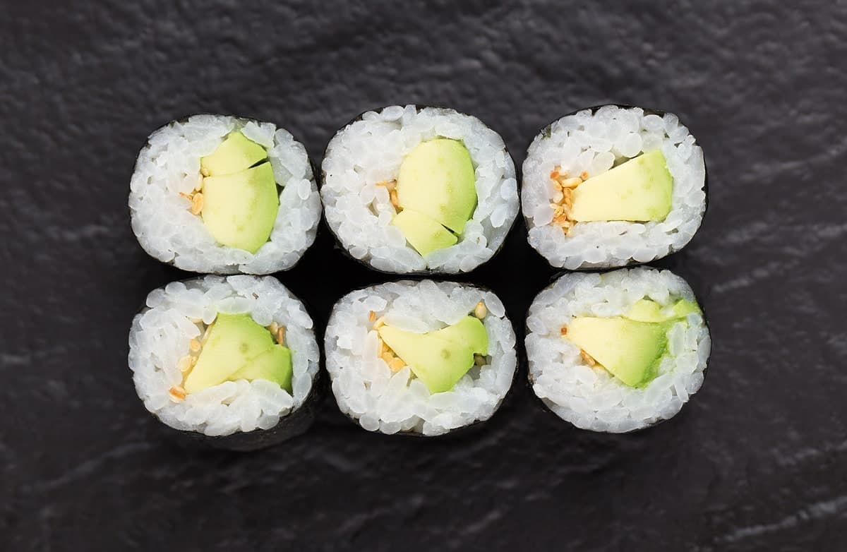 авокадо / ікра корюшки / огірок / суші-сир / вугор / водорості норі / рис
