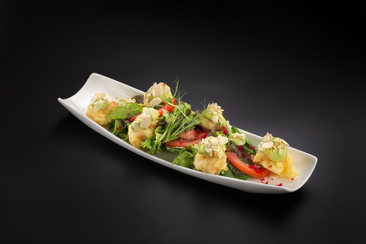 Креветка тепан / овочевий мікс / помідор / ікра корюшки / мигдальна стружка / мікро грін / соус майонез-васабі