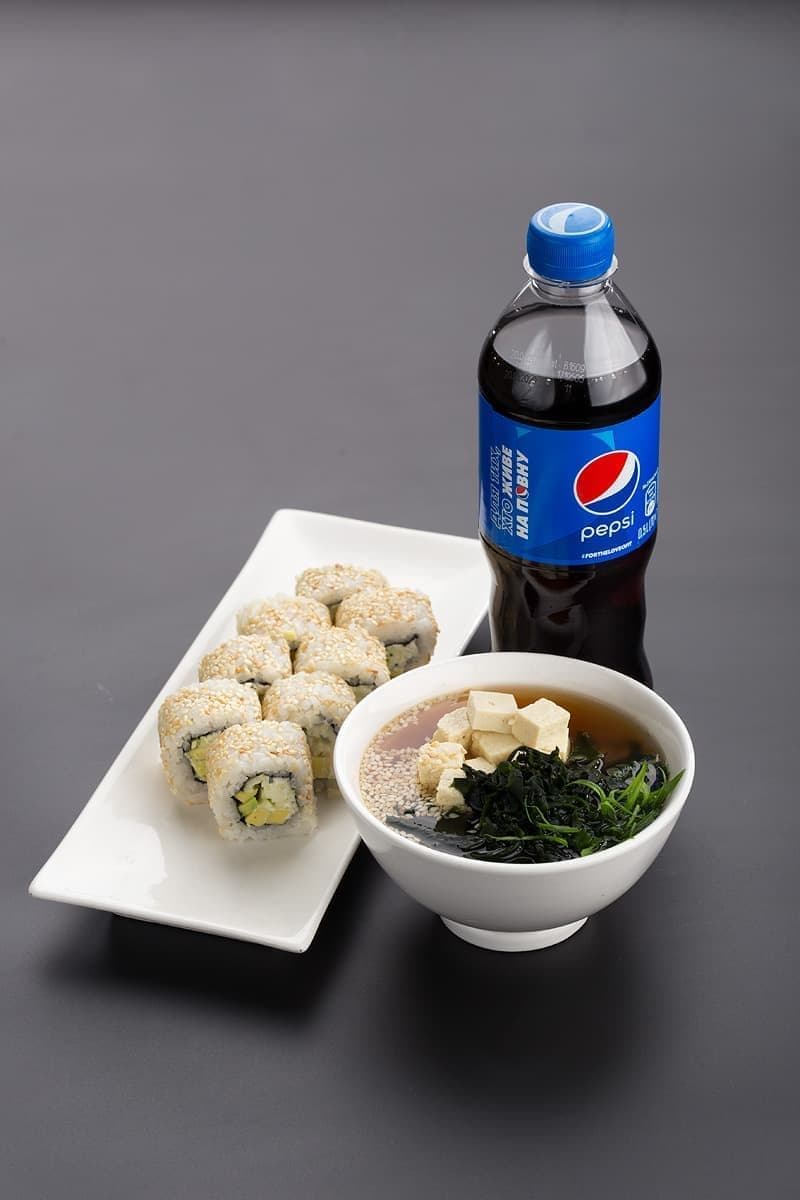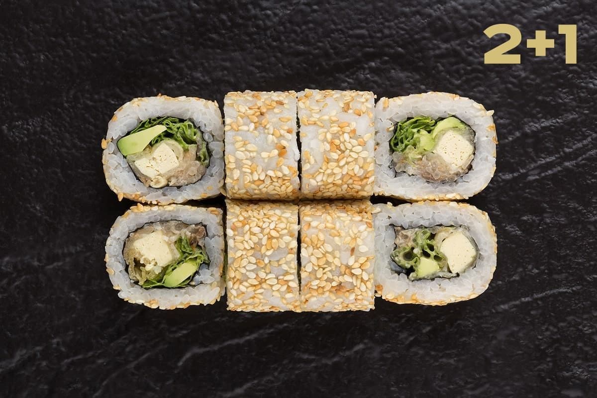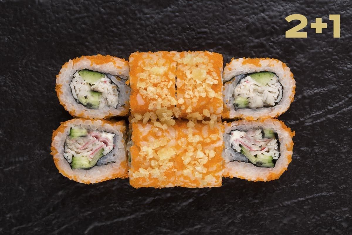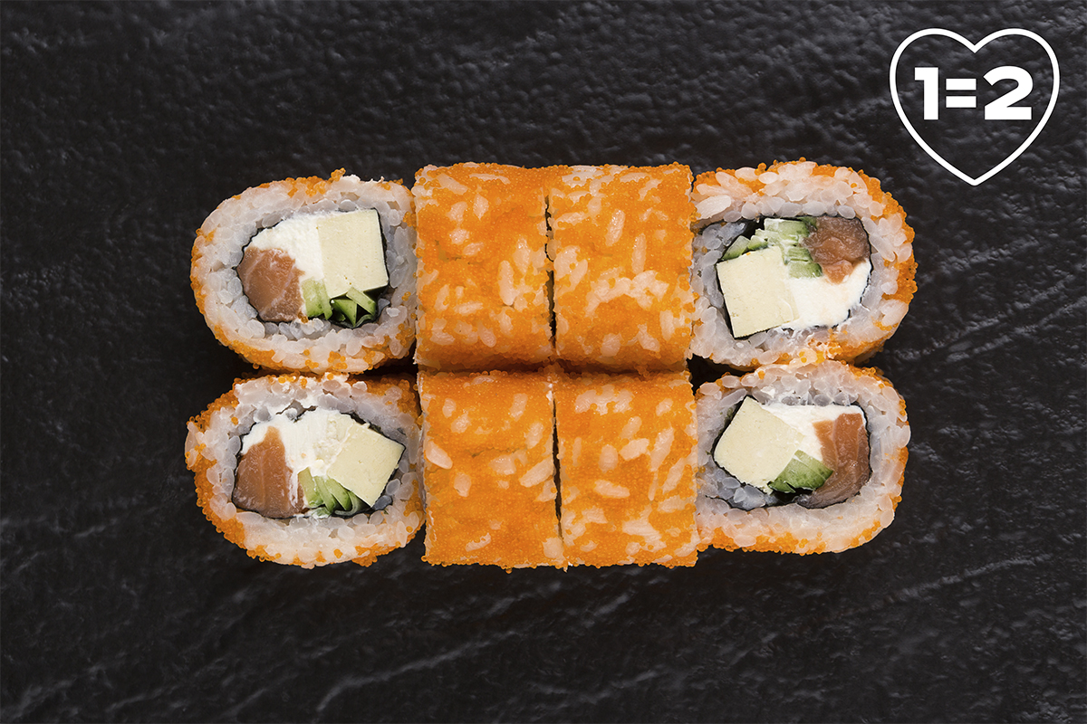 рол Каліфорнія / Каліфорнія з гострим лососем / Каліфорнія з сиром / рол Філадельфія у ікрі Делюкс / рол Овочевий з тофу