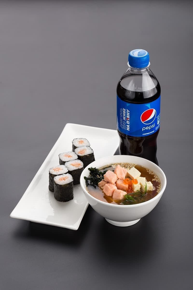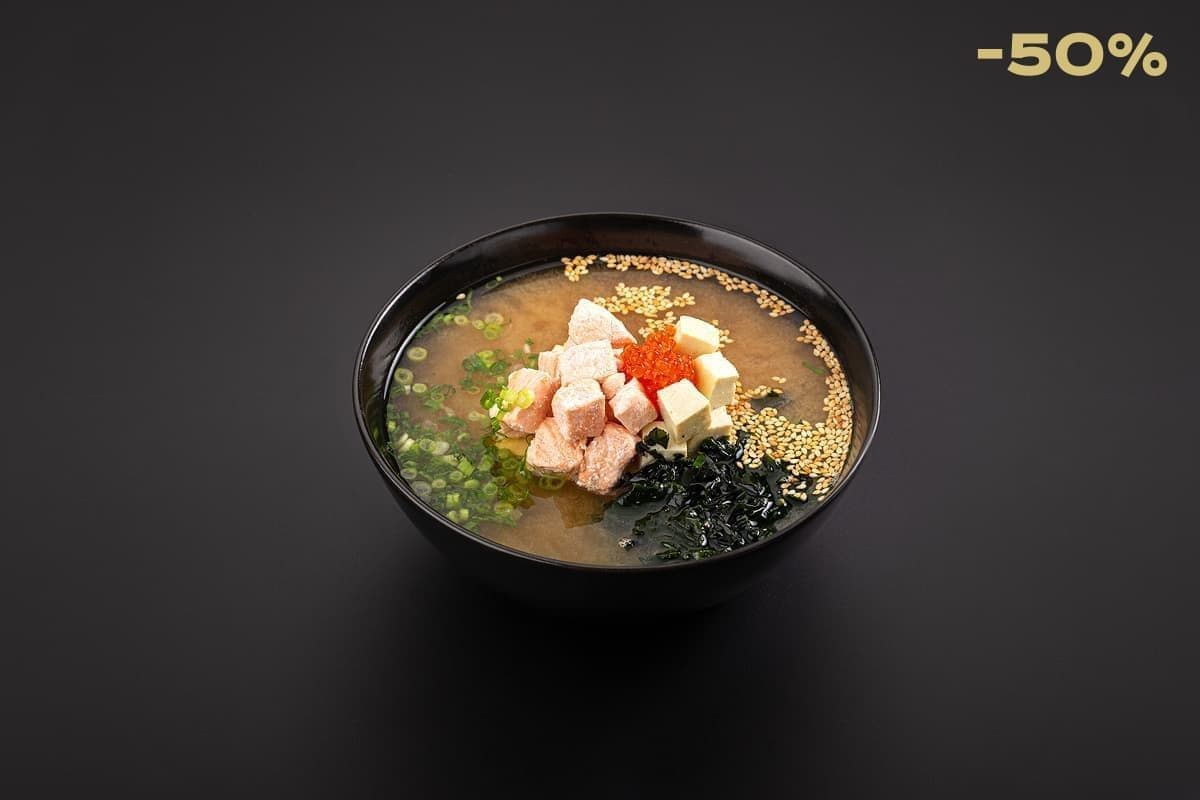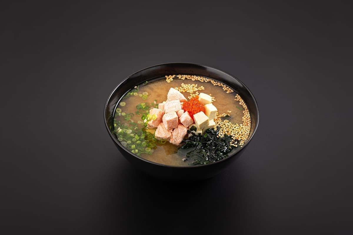 місо бульйон / лосось / тофу / червона ікра / водорості вакаме / зелена цибуля / насіння кунжуту