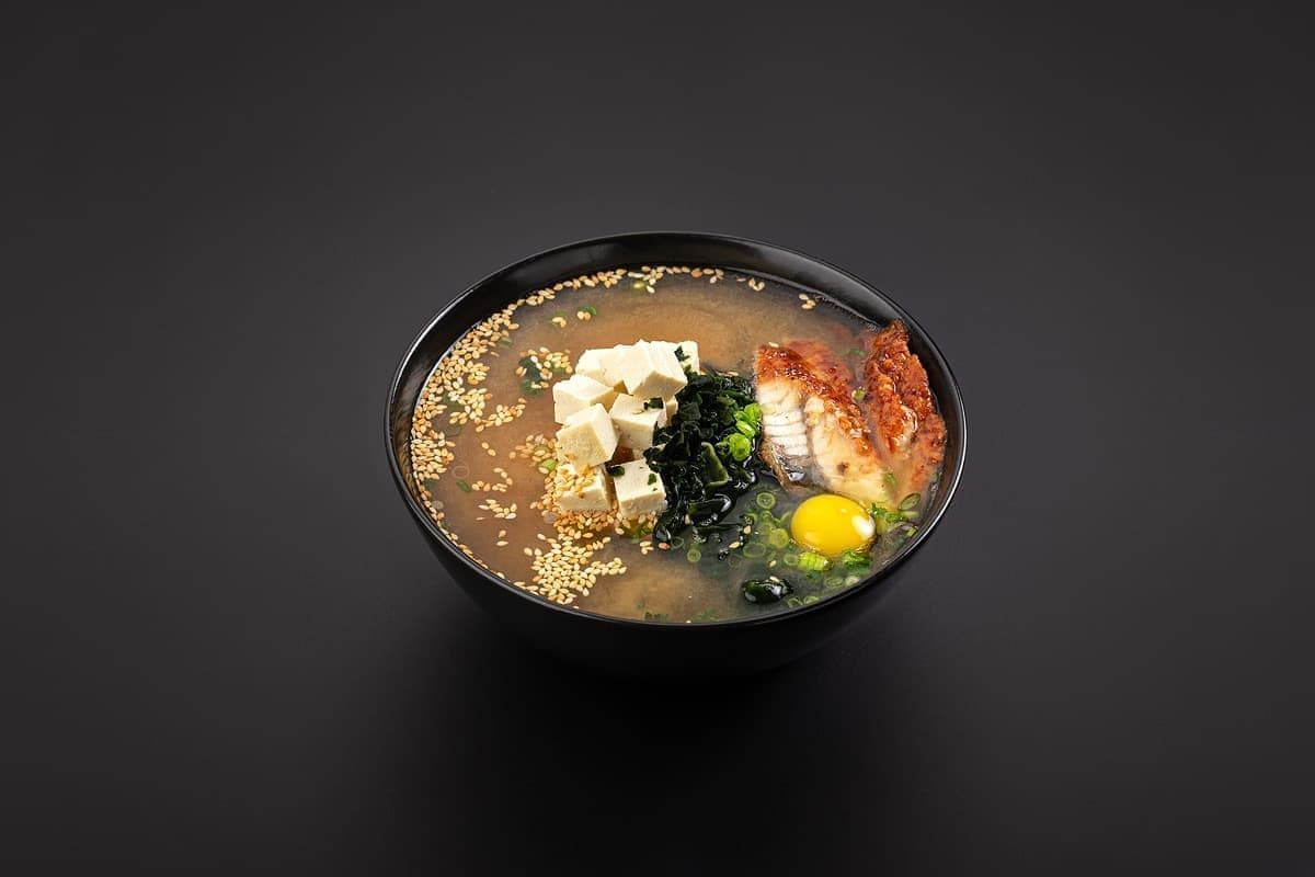 зелена цибуля / місо бульйон / вугор / тофу / перепелине яйце / водорості вакаме / насіння кунжуту