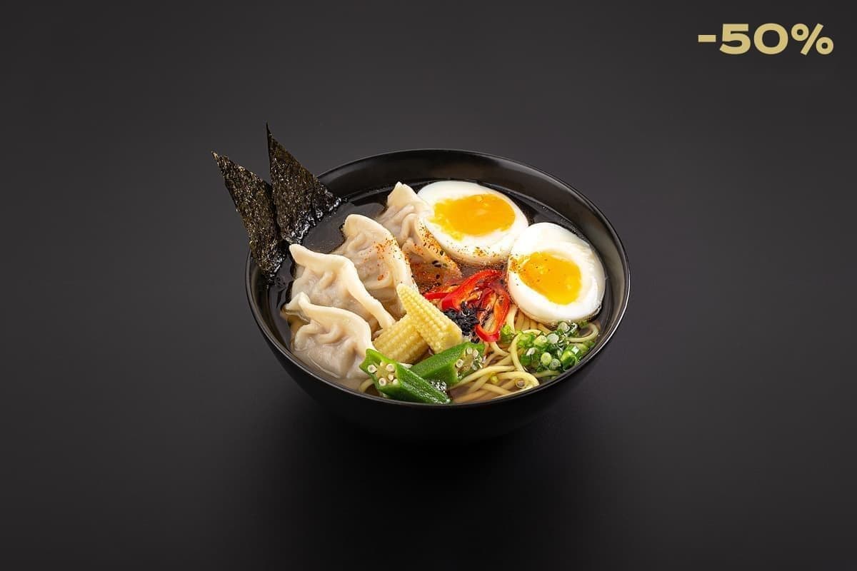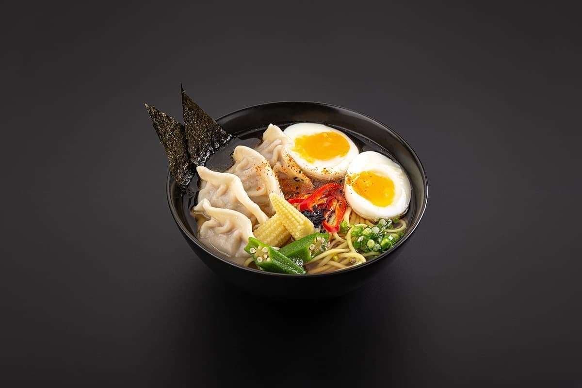бульйон Рамен / гьодза з качкою / локшина яєчна / яйце / кукурудза бебі / бамія / зелена цибуля / чорний кунжут / водорості норі / сім спецій / перець чілі