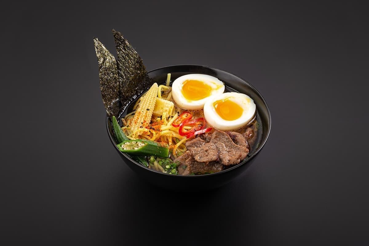 бульйон Рамен / яєчна локшина / стейк з яловичини / яйце / перець чілі / кукурудза бебі / зелена цибуля / чорний кунжут / водорості норі / бамія / сім спецій