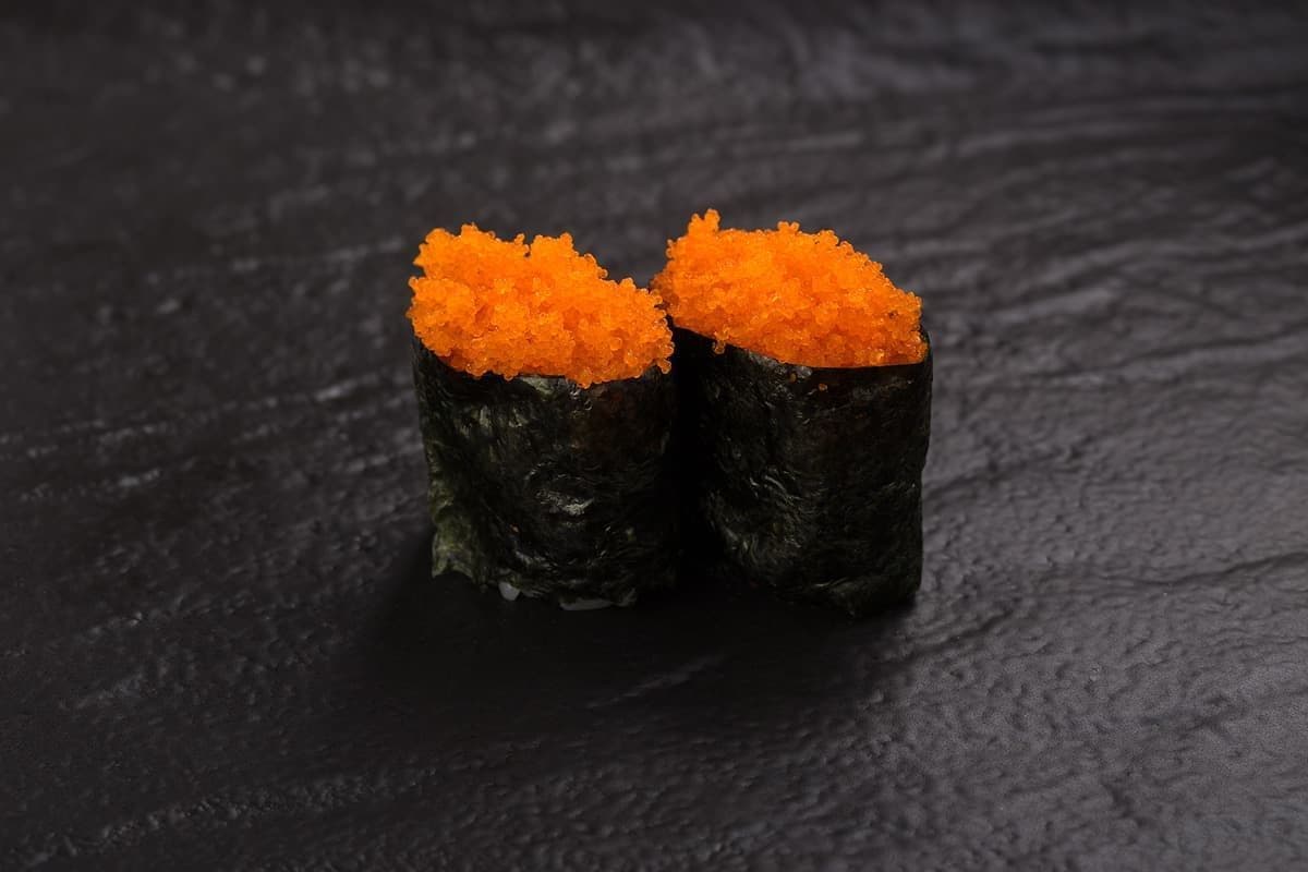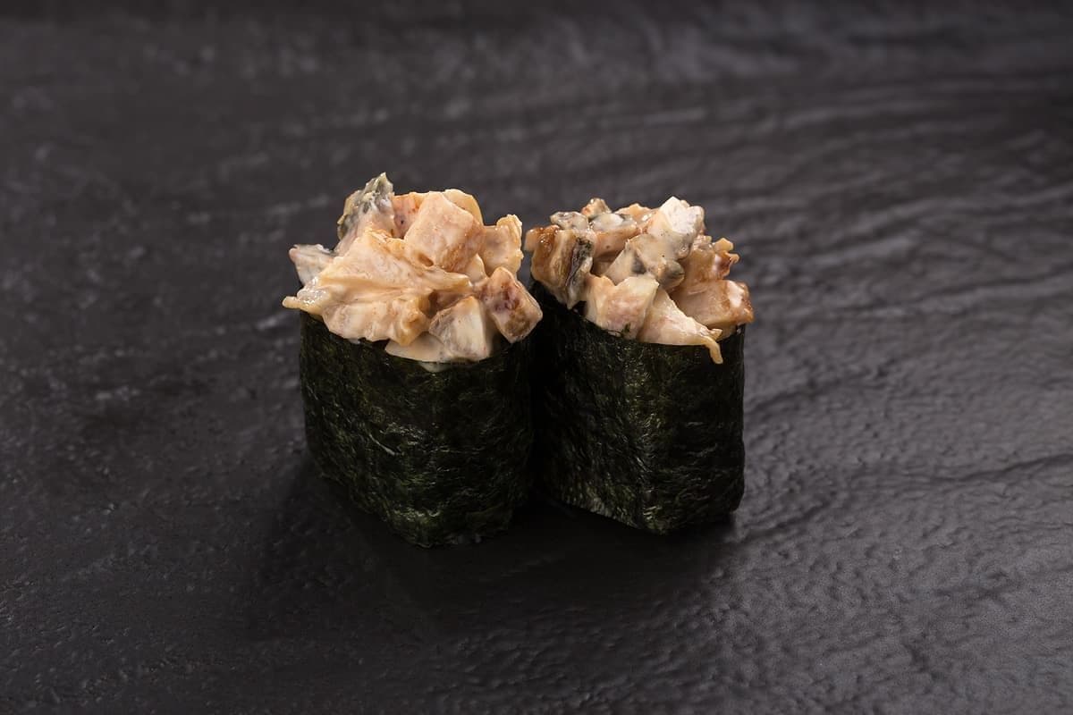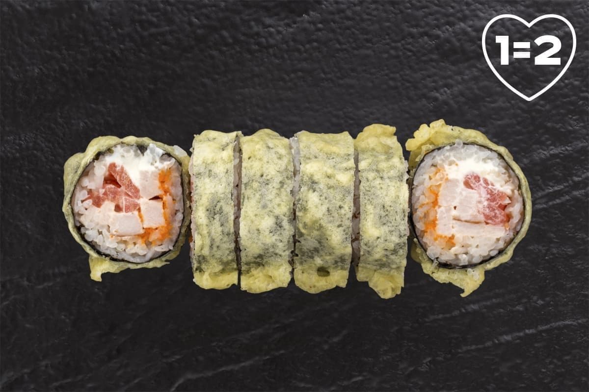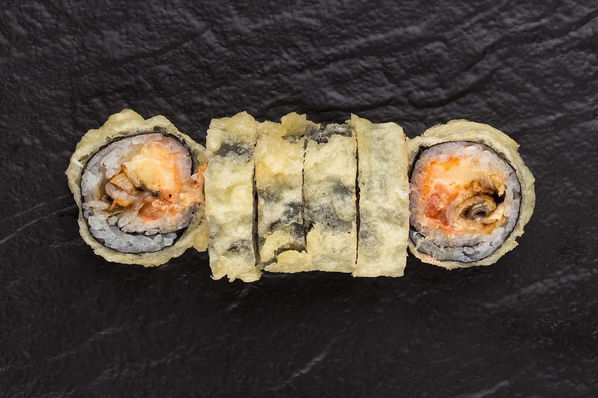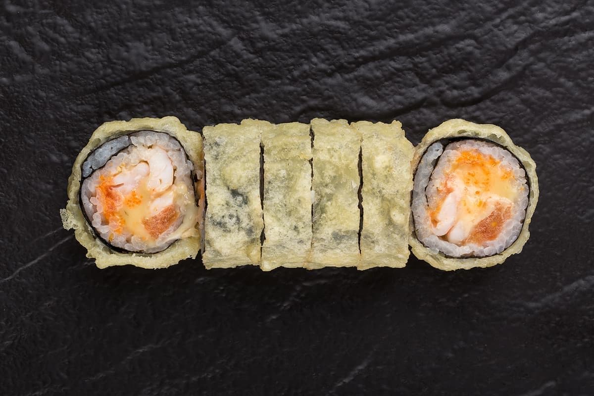 ікра корюшки / помідор / сир твердий / вугор / гострий майонез / рис / водорості норі / борошно темпура