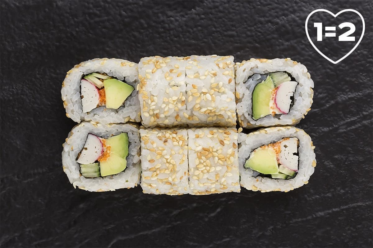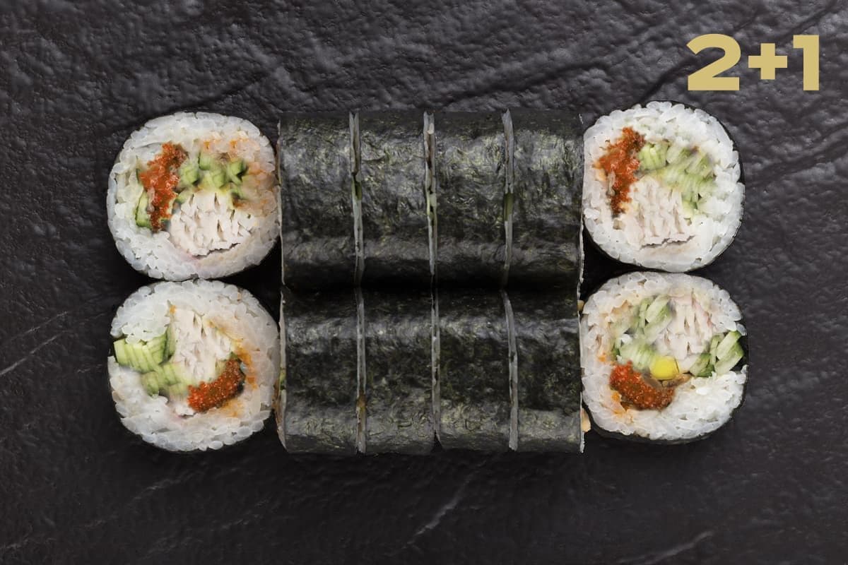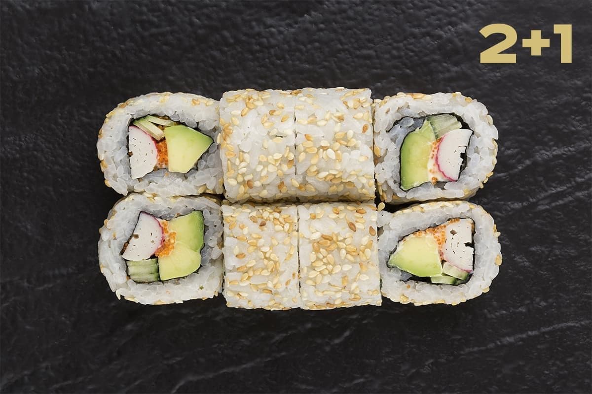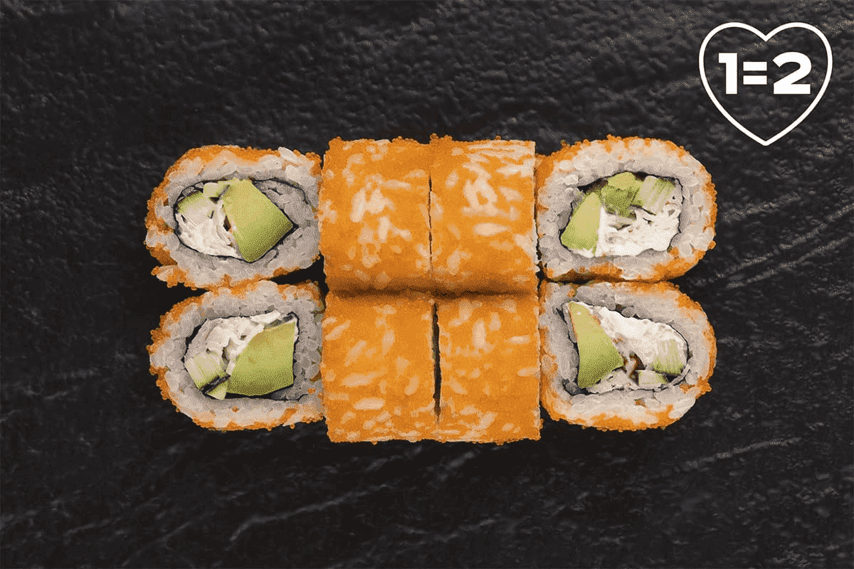 Макі з авокадо / Каліфорнія Краб Кранч / Каліфорнія з сиром / Філадельфія з лососем / Магору