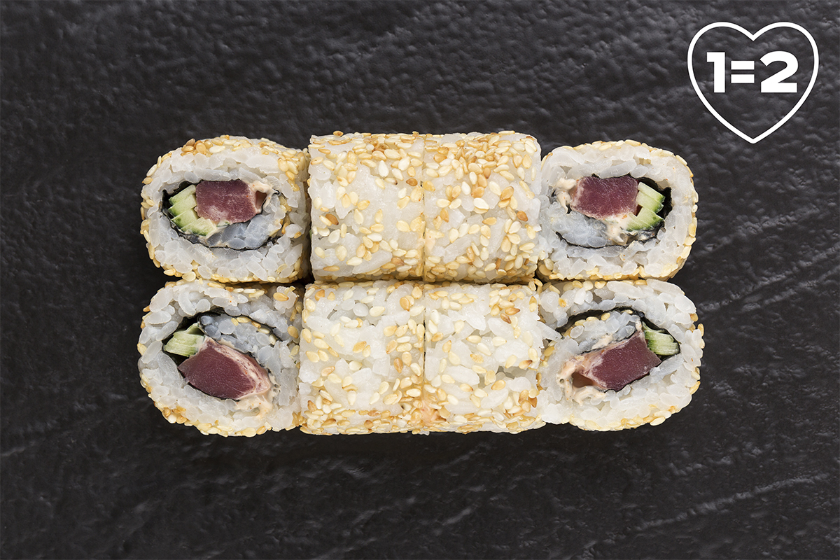 суші-сир / огірок / листя салату / тунець / ікра корюшки чорна / сім спецій / помідор