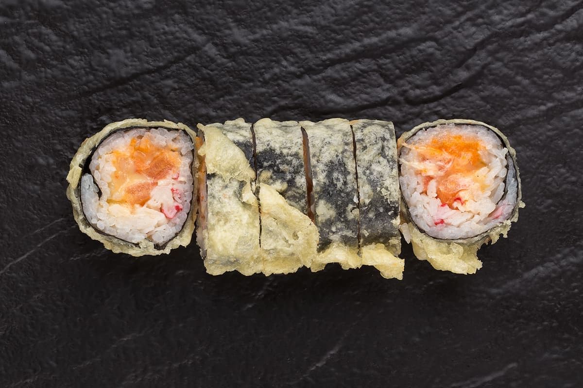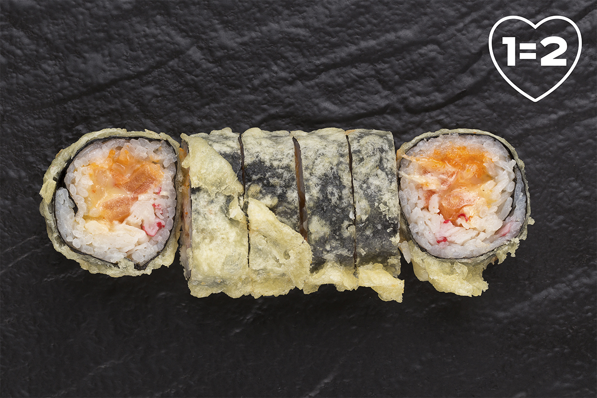 ікра корюшки / Сурімі / помідор / сир твердий / борошно темпура / рис / водорості норі / гострий майонез
