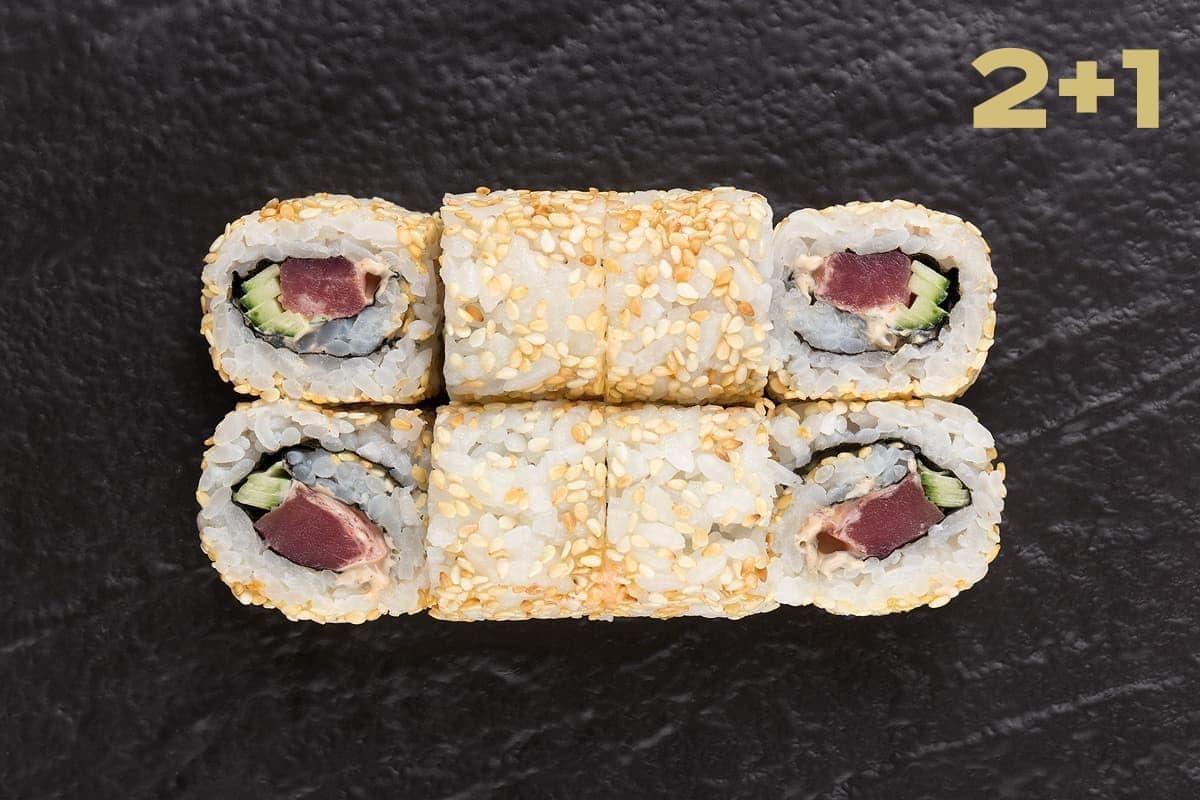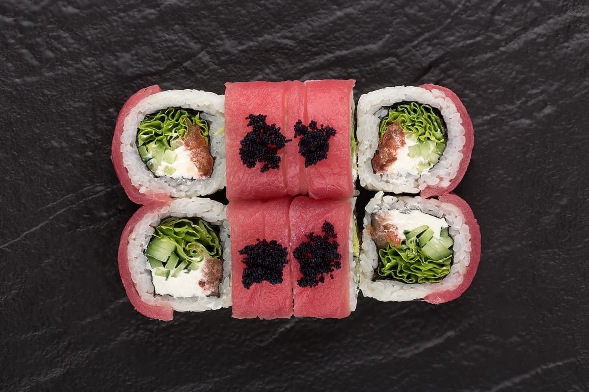 суші-сир / огірок / листя салату / тунець / ікра корюшки чорна / тигрова креветка