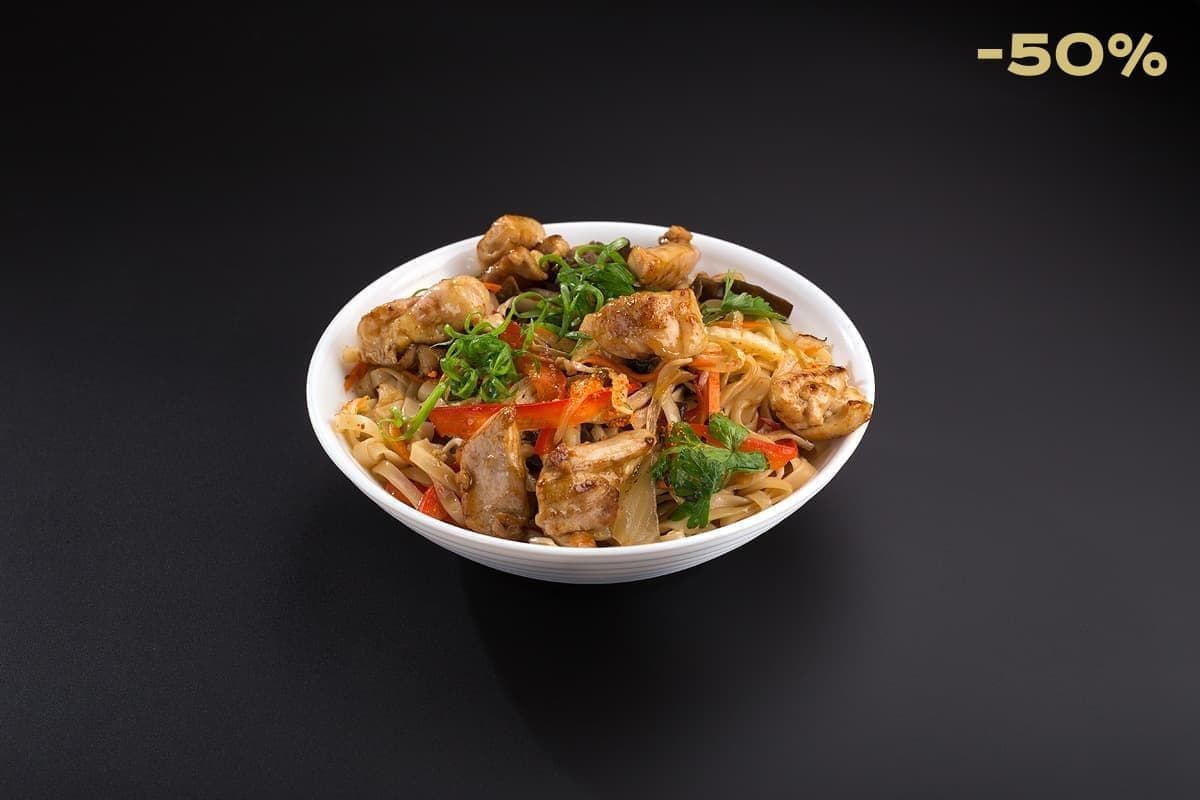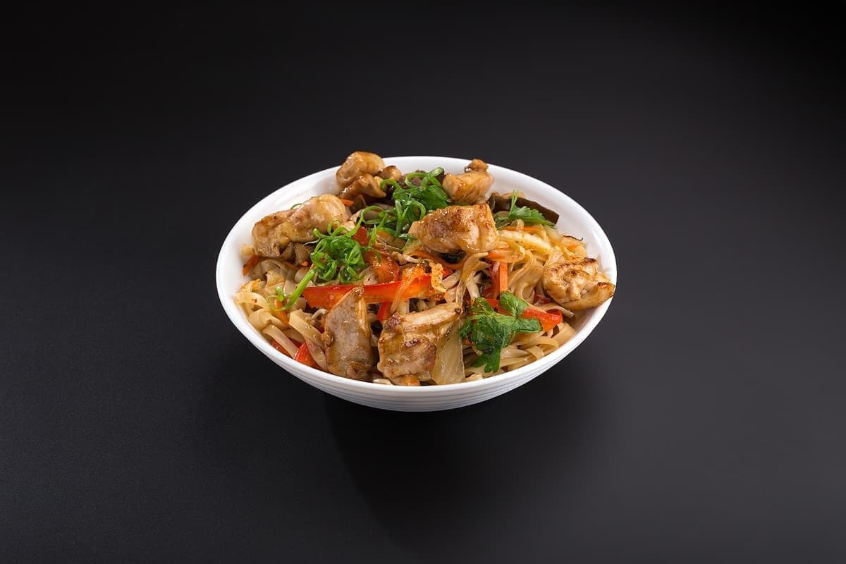курячі стегенця / овочевий мікс / рисова локшина / спеції / устричний соус / зелена цибуля