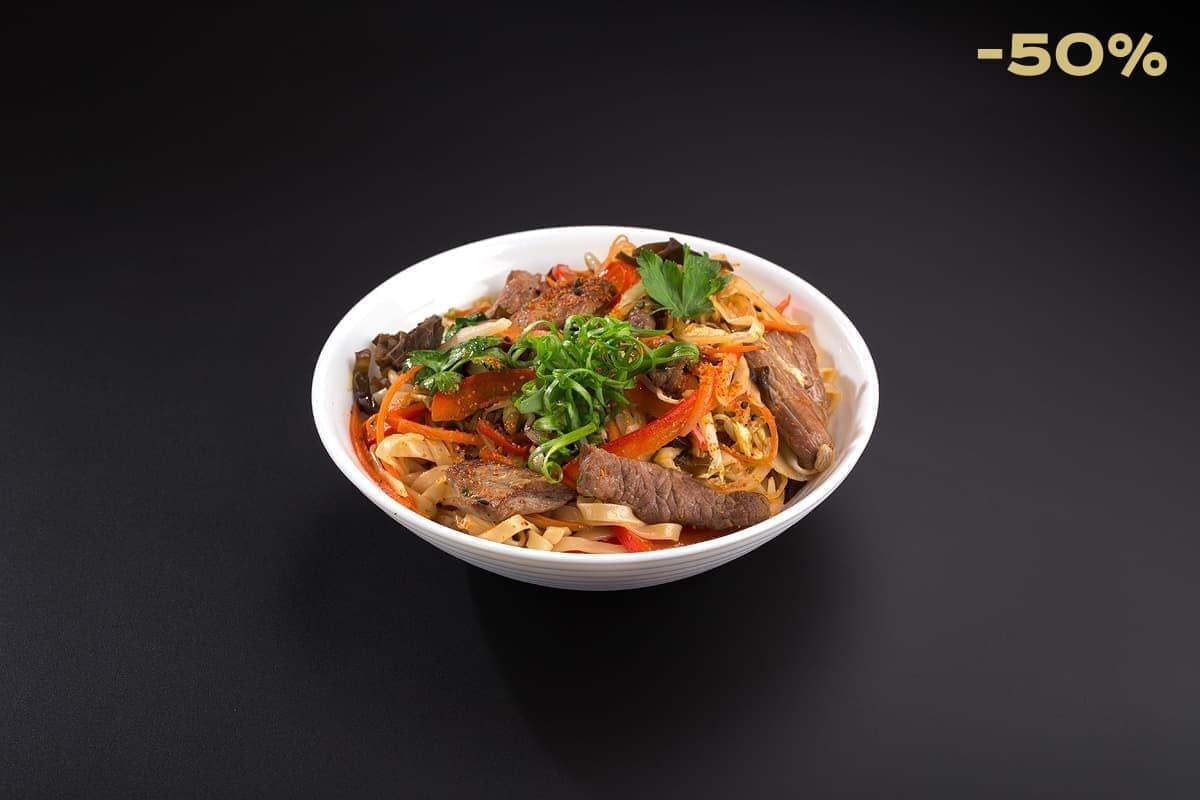 локшина удон / овочевий мікс / спеції / устричний соус / яловичина / зелена цибуля