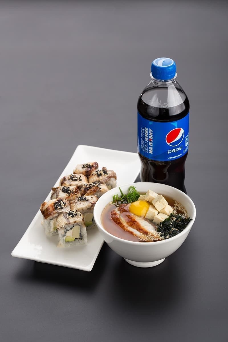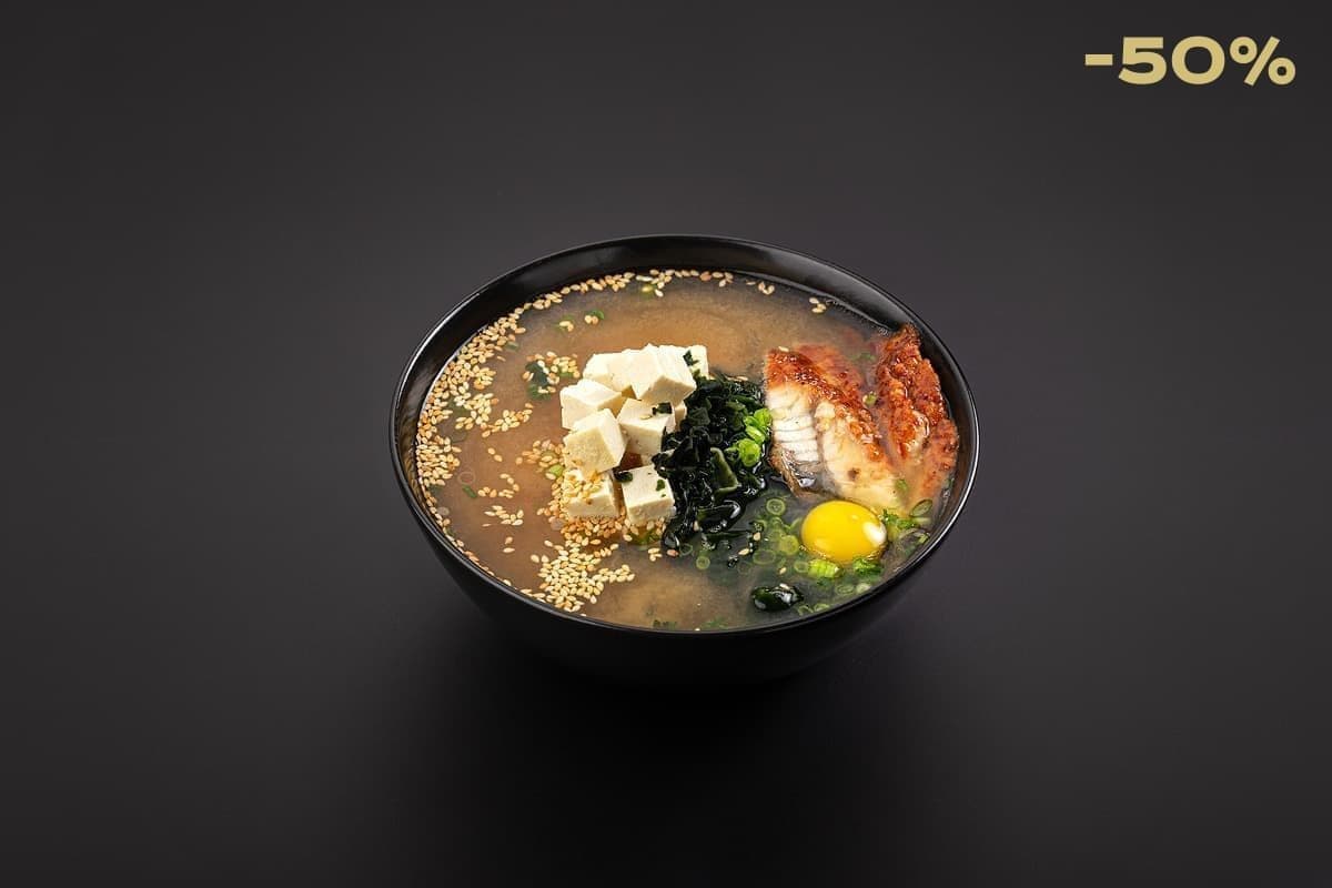 місо бульйон / вугор / тофу / перепелине яйце / водорості вакаме / зелена цибуля / насіння кунжуту