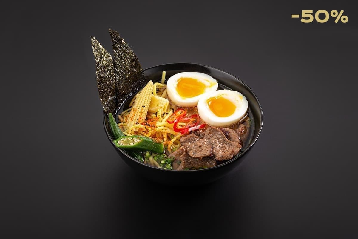 бульйон Рамен / локшина яєчна / яловичина / яйце / перець чілі / кукурудза бебі / зелена цибуля / чорний кунжут / водорості норі / бамія / сім спецій