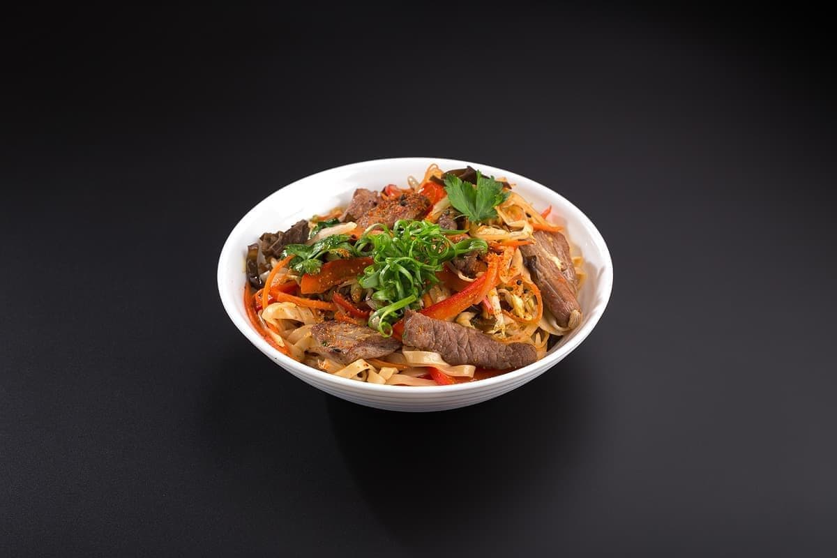 яловичина / овочевий мікс / рисова локшина / спеції / устричний соус / зелена цибуля