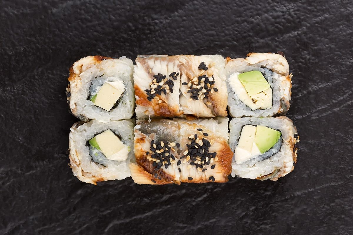 авокадо / кунжут чорний та білий / вершковий сир / тофу / вугор / соус для вугря / водорості норі / рис
